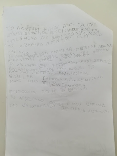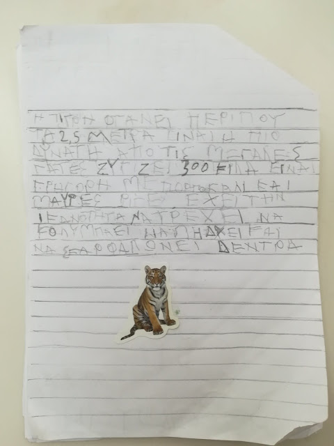 Η εργασία που έχουν να κάνουν οι μαθητές στο σπίτι είναι να αναζητήσουν πληροφορίες, με τη βοήθεια των γονέων τους, για το ζωάκι τους. Να επιλέξουν τις πληροφορίες που θέλουν να μας μεταφέρουν και να τις αντιγράψουν με μολύβι στη πίσω σελίδα από το κολάζ τους.