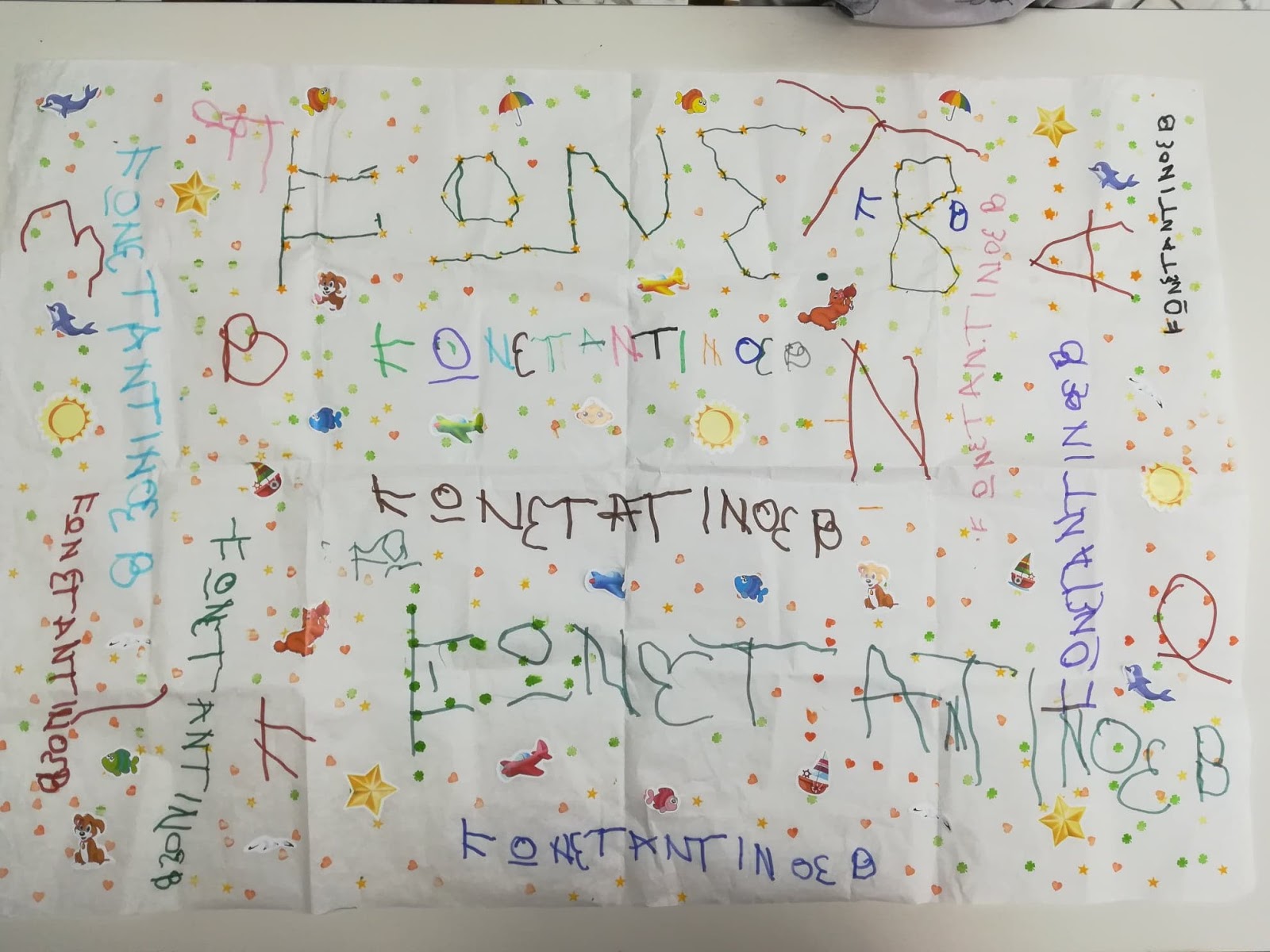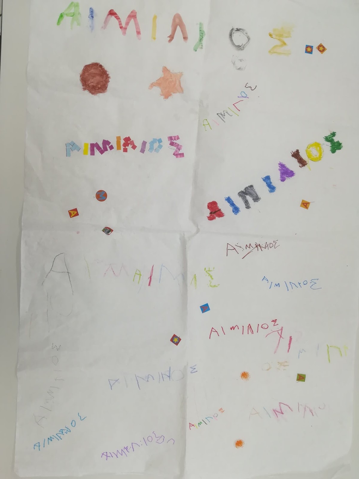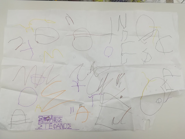 Περπάτησαν με τα ονόματα τους αγκαλιά, έτρεξαν, πήδηξαν, ανέμισαν τα ονόματα ψηλά, τα ανεβοκατέβασαν να ακούσουν τον ήχο που κάνει το χαρτί κ.α. Μετά από όλα αυτά περάσαμε στην αίθουσα όπου κλήθηκαν όλοι να τσαλακώσουν πολύ πολύ σφιχτά το χαρτί τους για να σχηματιστεί το νήμα του καθενός. (Ανάπτυξη λεπτής κινητικότητας και ενδυνάμωση των άκρων τους).