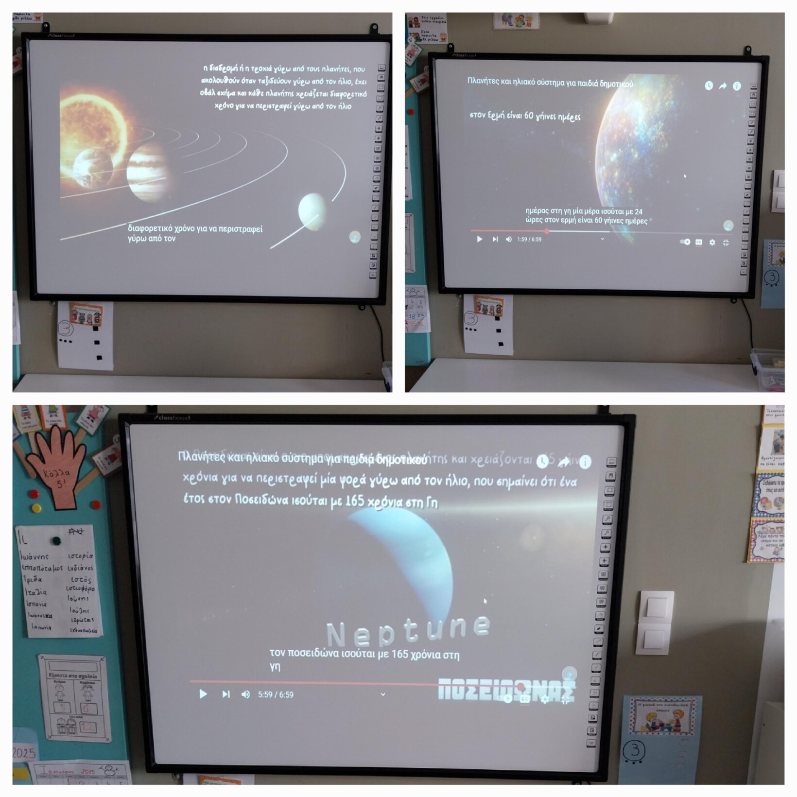 Για να αναπτύξουμε την κριτική τους σκέψη, ρωτήσαμε πότε περνάει πιο γρήγορα η ώρα στο σχολείο και απάντησαν την ώρα του διαλείμματος που παίζουν ενώ πιο αργά μεσα στην τάξη που κάνουμε μάθημα. Κι όμως η ώρα στα ρολόγια κυλάει με τον ίδιο ρυθμό! Ένα άλλο παράδειγμα δόθηκε με τη γη και τους άλλους πλανήτες. Έτσι, για να περιστραφεί η γη γύρω απο τον ήλιο χρειάζεται 24 ώρες (αναφέροντας τα παιδιά οτι τη νύχτα που κοιμόμαστε περναει πιο γρήγορα η ωρα) ενώ ο Ερμής 6ο γήινες ημέρες και ο Ποσειδώνας 165 γήινα χρόνια! Ανάλογα λοιπόν σε ποιον πλανήτη βρίσκεσαι ο χρόνος κυλάει διαφορετικά…Συνεπώς, είναι σχετικός!