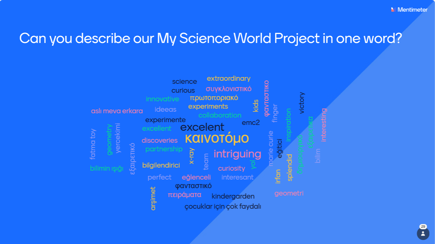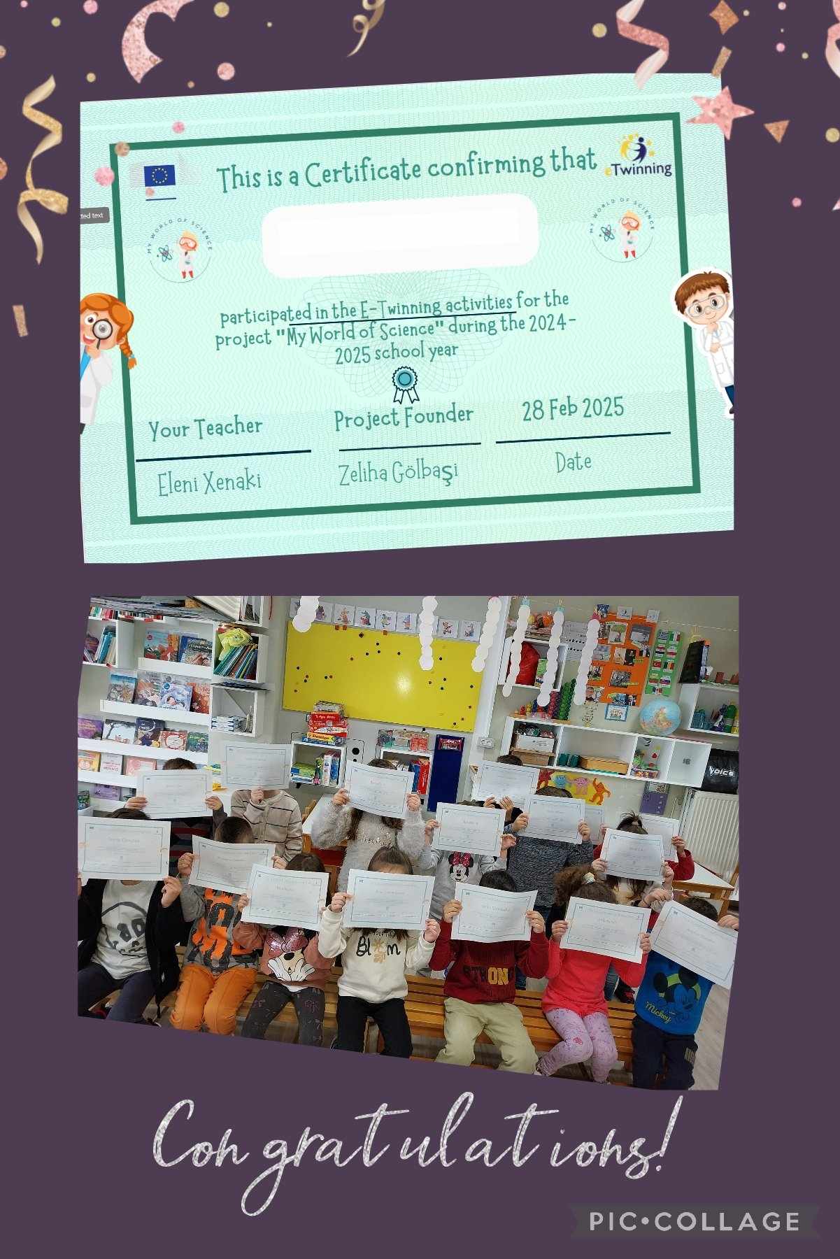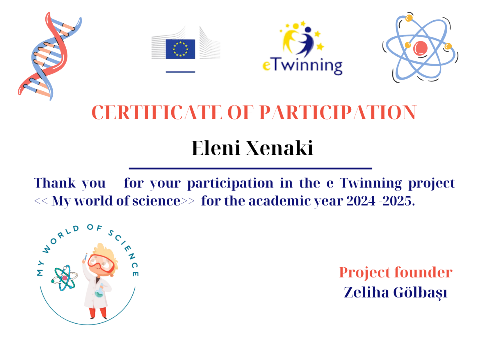 Σκοπός του etwinning έργου είναι τα παιδιά να μάθουν για την επιστήμη, τις εφευρέσεις, τις ανακαλύψεις, τη ζωή των επιστημόνων και τη συνεισφορά τους στην ανθρωπότητα. Έτσι, αναμένεται να αυξηθούν το ενδιαφέρον και η ευαισθητοποίηση τους για την επιστήμη και τους επιστήμονες και να συνδέσουν την επιστήμη με την καθημερινότητα με βιωματικές δραστηριότητες. Με τα εργαλεία web.2 που χρησιμοποιούνται σε όλο το έργο, τα παιδιά θα μάθουν να χρησιμοποιούν τις δεξιότητες του 21ου αιώνα. Στο έργο αρχικά, συμμετέχουν εκπαιδευτικοί απο Ελλάδα, Τουρκία, Ρουμανία, Λιθουανία. Το έργο θα διαρκέσει 3 μήνες με διάφορες δραστηριότητες τις οποίες μπορείτε να βλέπετε και στην ιστοσελίδα του έργου https://etwinningmyworldofscience.blogspot.com/ όπου αναρτάται υλικό και από τα υπόλοιπα μέλη.