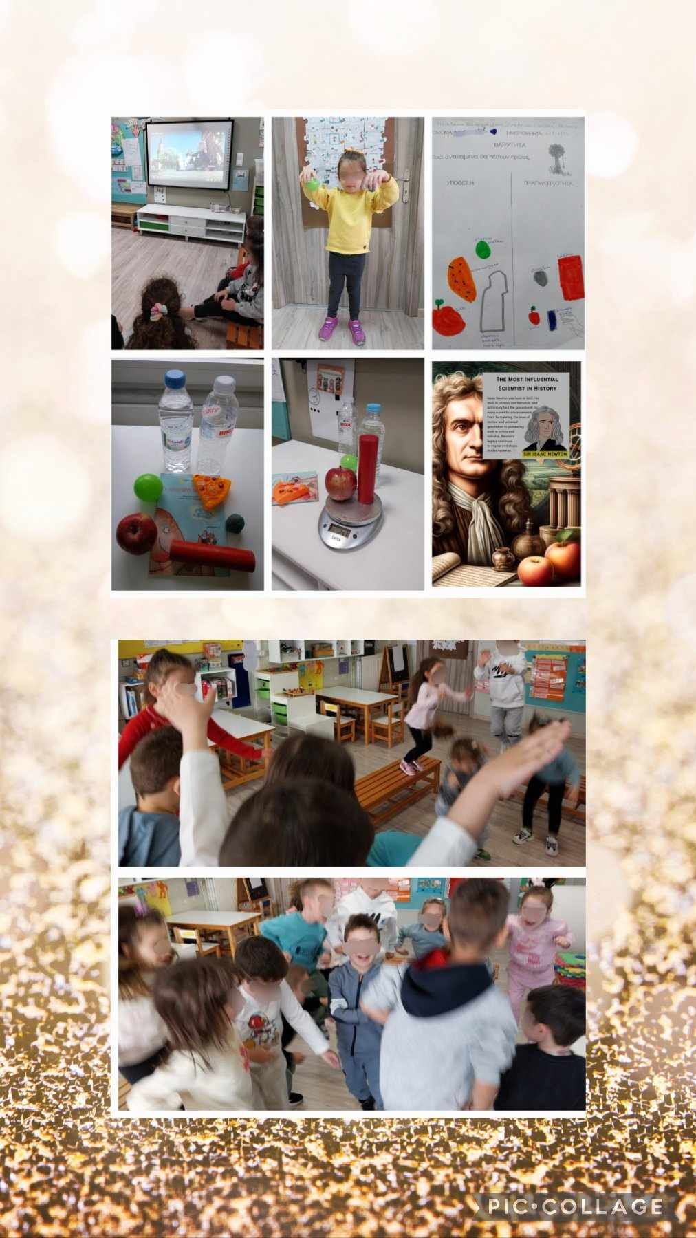 Μιλήσαμε για τον επιστήμονα (ήταν φυσικός, μαθηματικός, αστρονόμος και με τις θεωρίες του ενέπνευσε κι άλλους επιστήμονες), είδαμε ένα βίντεο για την ανακάλυψη της βαρύτητας (https://www.youtube.com/watch?v=jwPc0kK9VHU&t=1s) και τη σημασία της στο πλανητικό σύστημα, συζητήσαμε σχετικά και λύσαμε απορίες. Γίναμε μικροί επιστήμονες κάνοντας πειράματα με διαφορετικά αντικείμενα και σχεδιάζοντας τις υποθέσεις μας ανάμεσα σε 2 αντικείμενα κάθε φορά (ποιο θα πέσει πρώτο) και μετά τι συμβαίνει στην πραγματικότητα. Για επιβεβαίωση, ζυγίσαμε και συζητήσαμε τα υλικά από τα οποία κατασκευάζονται τα αντικείμενα. Προσπαθήσαμε να πετάξουμε ή πηδούσαμε ψηλά αλλά πάντα πέφταμε κάτω εξαιτίας της βαρύτητας. Μέσα από την εξερεύνηση και τον πειραματισμό κατανοήσαμε καλύτερα το φαινόμενο. Στο τέλος, έπαιξαν σε ζευγάρια και ψηφιακά παιχνίδια σχετικά με όσα έμαθαν. Τους άρεσαν όλα τόσο πολύ!