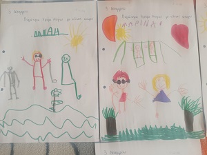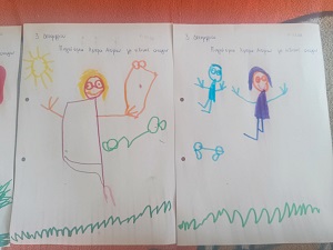 Στο ολοήμερο τμήμα ως αφόρμηση διαβάσαμε το παραμύθι και είδαμε ένα σχετικό βίντεο ” Η Αργυρώ γελάει’. Τα παιδιά ύστερα έγιναν οδηγοί σε άτομα με τύφλωση, προσπάθησαν να επικοινωνήσουν με νοήματα σε κάποιους που δεν ακούνε και βοήθησαν όσους έχουν κινητικά προβλήματα. Τέλος αποφασίσαμε να κατασκευάσουμε μια αφίσα, η οποία θα σταλθεί και για τη δράση, με μια παιδική χαρά όπου όλα τα παιδιά μπορούν και πρέπει να παίζουν. Τα παιδιά ζωγράφισαν και έγραψαν το μήνυμα ‘ ΟΛΑ ΤΑ ΠΑΙΔΙΑ ΣΤΟ ΠΑΡΚΟ’