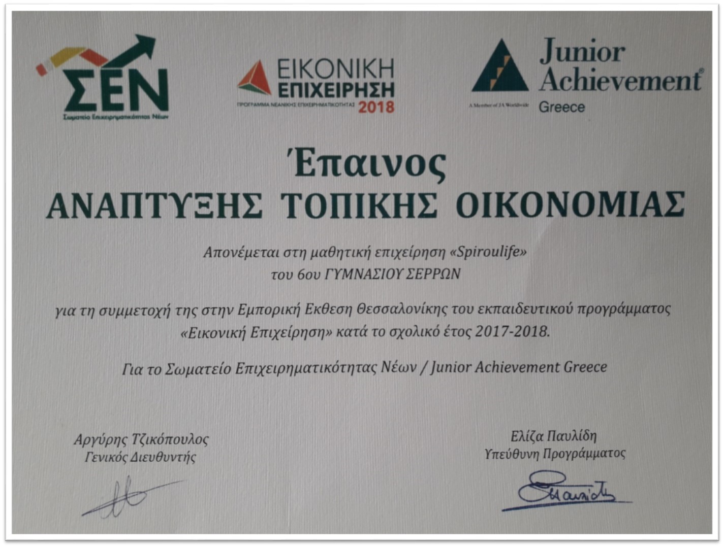 Συγχαρητήρια στους μαθητές/τριες της μαθητικής επιχείρησης Spirulife του 6ου Γυμνασίου Σερρών (Β3α και Γ1β) που απέσπασαν τον έπαινο ΑΝΑΠΤΥΞΗΣ ΤΟΠΙΚΗΣ ΟΚΟΝΟΜΙΑΣ κατά τη συμμετοχή τους στην εμπορική έκθεση Θεσσαλονίκης του εκπαιδευτικού προγράμματος “Εικονική επιχείρηση“.