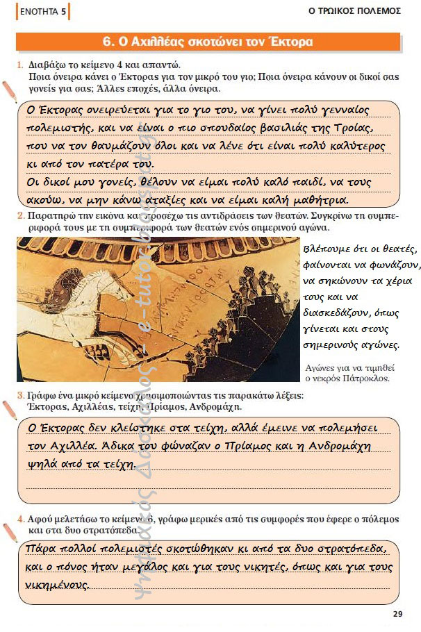 3. Πώς τίμησε ο Αχιλλέας τον νεκρό φίλο του; Θα σε βοηθήσει το κείμενο 5. Ο Αχιλλέας για να τιμήσει τον Πάτροκλο, αφού τον έθαψε, οργάνωσε προς τιμήν του αγώνες με πολλά αθλήματα, που πήραν μέρος όλα τα παλικάρια των Αχαιών και κέρδισαν σπουδαία βραβεία. Έτσι θα θυμούνταν όλοι, πόσο δυνατός και γενναίος ήταν ο Πάτροκλος.