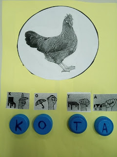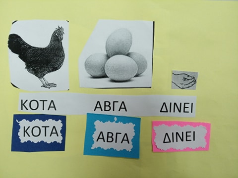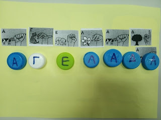 Αφού αναφερθήκαμε στα χαρακτηριστικά της Ελληνικής Νοηματικής Γλώσσας εκτύπωσα το δακτυλικό αλφάβητο από εδώ δύο φορές για κάθε μαθητή. Τα παιδιά κλήθηκαν να επιλέξουν τις σωστές χειρομορφές, να τις κόψουν και να τις κολλήσουν, ώστε να σχηματίσουν το όνομά τους. Στη συνέχεια, ζωγράφισαν στο περιθώριο αυτό που τους άρεσε περισσότερο από το παραμύθι.