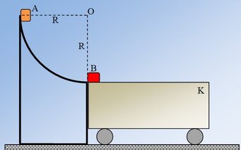 Σε οριζόντιο δάπεδο είναι στερεωμένη μια λεία τροχιά σχήματος τεταρτοκυκλίου, κέντρου Ο. Το οριζόντιο τμήμα στο κάτω άκρο της τροχιάς συνδέεται ομαλά με την πάνω επιφάνεια ενός μικρού καροτσιού Κ (βλ. σχήμα). Πάνω στην τροχιά βρίσκεται ένα μικρό σώμα A, μάζας m1 = 4kg, το οποίο αφήνεται από την ηρεμία να ολισθήσει από ύψος h = R = 1,8 m πάνω από το οριζόντιο τμήμα της τροχιάς. Στο αριστερό άκρο του καροτσιού υπάρχει ένα σώμα B, μάζας m2 = 2kg. Τα σώματα A και B μπορούν να θεωρηθούν υλικά σημεία. Μετά την κρούση τους, τα A και B κολλάνε μεταξύ τους. Είναι γνωστό ότι ο συντελεστής τριβής ολίσθησης ανάμεσα στα A, B και το καρότσι Κ είναι μ = 0,5, ενώ η τριβή στα αξονάκια των τροχών του καροτσιού θεωρείται αμελητέα.
