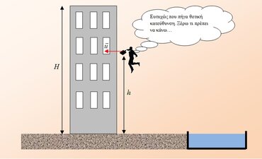 Ο γνωστός Βρετανός πράκτορας 007, μάζας Μ = 80kg, κρατώντας βαλίτσα μάζας m = 5kg με απόρρητα έγγραφα, καταδιώκεται μέσα σε έναν ουρανοξύστη, από ομάδα μισθοφόρων του εχθρού και για να ξεφύγει ανεβαίνει στην ταράτσα του κτιρίου, που βρίσκεται σε ύψος Η = 180m από το έδαφος. Φτάνει στην άκρη της ταράτσας και καταστρώνει ένα παράτολμο σχέδιο. Πηδάει κατακόρυφα χωρίς αρχική ταχύτητα, γιατί έχει παρατηρήσει ότι υπάρχει μια πισίνα με νερό σε οριζόντια απόσταση d = 6m από την κατακόρυφη διεύθυνση της πτώσης. Ενώ βρίσκεται σε ύψος h = 100m από το έδαφος, εκτοξεύει οριζόντια ως προς το έδαφος τη βαλίτσα, με κατεύθυνση αντίθετη από αυτήν που βρίσκεται η πισίνα. Η αντίσταση του αέρα θεωρείται αμελητέα, όλα τα σώματα θεωρούνται υλικά σημεία, η εκτόξευση διαρκεί αμελητέο χρονικό διάστημα και η βαρυτική επιτάχυνση g = 10m/s2. Οι ταχύτητες αναφέρονται σε ακίνητο παρατηρητή.