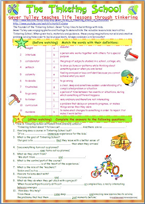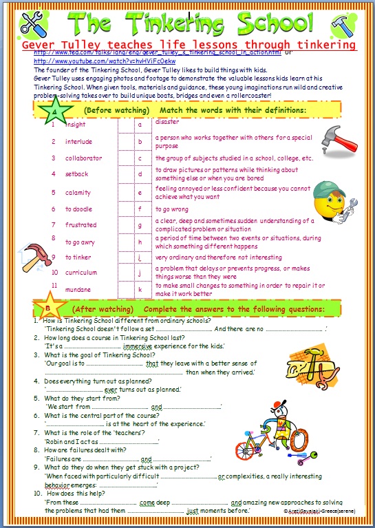 This worksheet is based on a TED video about a different kind of school. It contains a vocabulary matching activity (to be done before watching in order to enhance the students´ comprehension of the video), and a set of comprehension questions. After watching, the students are asked to complete the answers with the missing words or phrases.