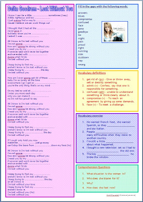 This song worksheet contains a gap-fill listening exercise, some vocabulary definitions – accompanied by a vocabulary exercise – and a few comprehension questions.