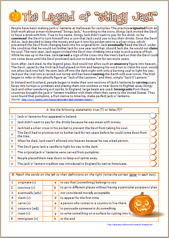 Here is a reading comprehension worksheet based on an article about the history of the jack-o’-lantern and the legend of “Stingy Jack”.