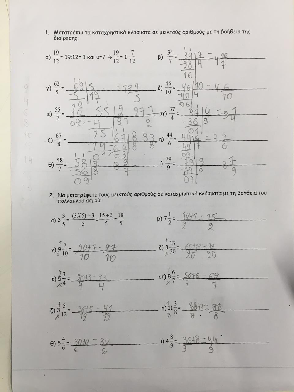 Σήμερα στα μαθηματικά δουλέψαμε ένα φυλλάδιο πάνω στα μεικτά και τα καταχρηστικά κλάσματα.