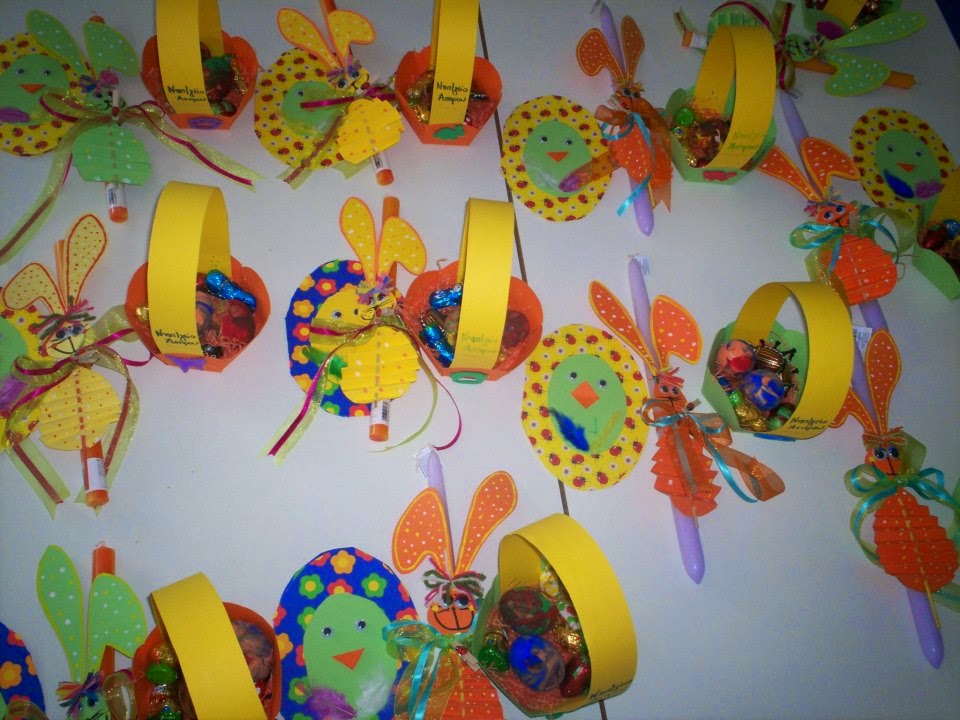 κάρτες πασχαλίτσες, λαγοί ποτήρια με λιχουδιές, καλαθάκια με αυγά