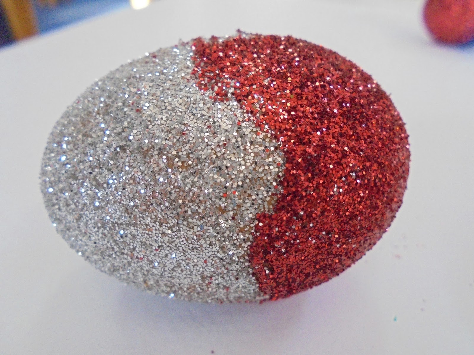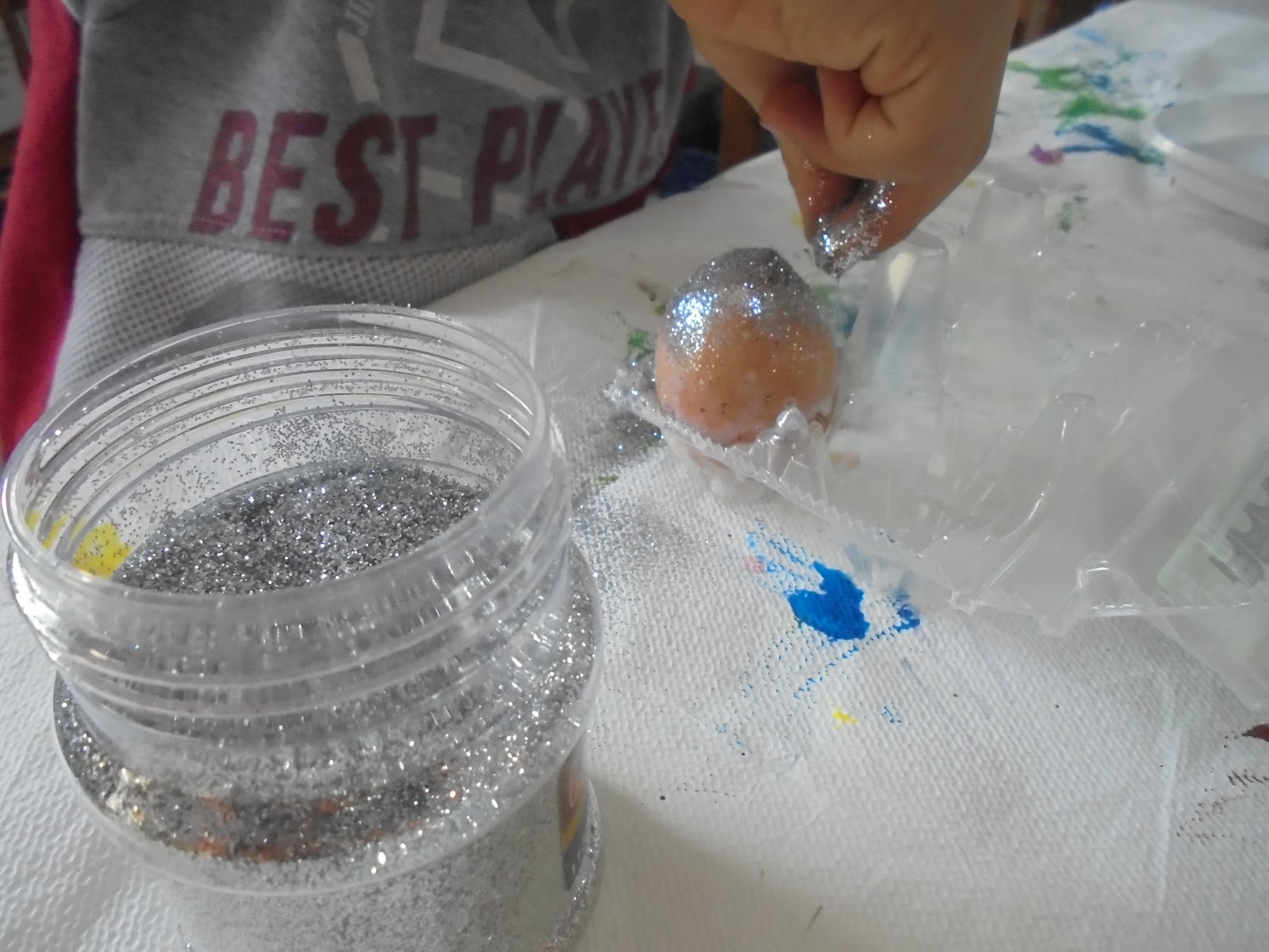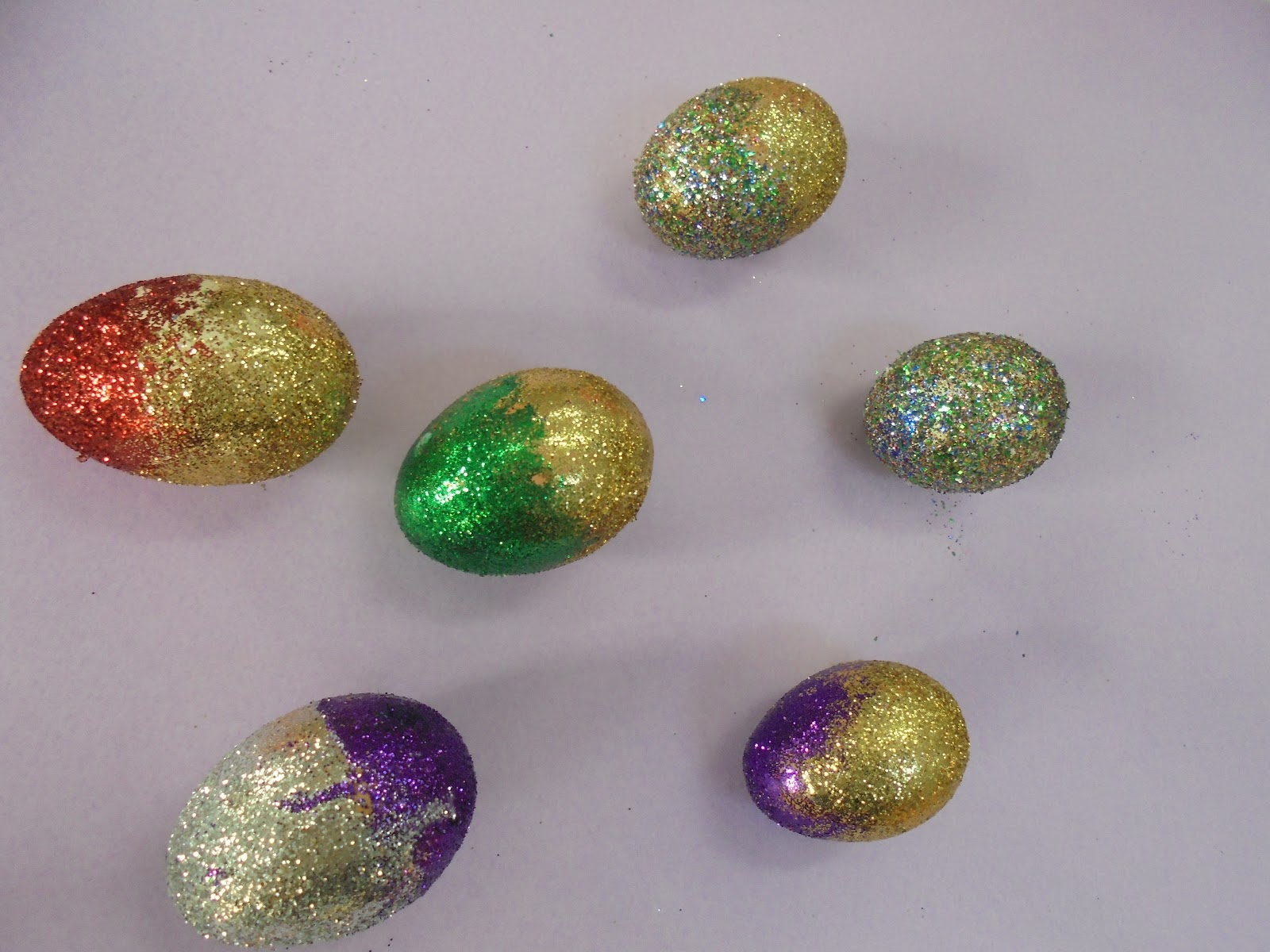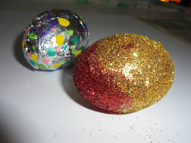 βάζουμε κόλα στο αυγό, πασπαλίζουμε με χρυσόσκονη και μετά άφθονη λακ και είναι έτοιμα