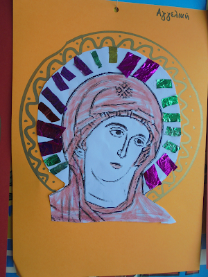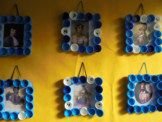 Κατασκευάσαμε κορνίζες με χαρτόνι, μπογιές, φωτογραφίες ηρώων και πλαστικά καπάκια