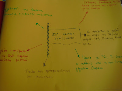 τα παιδιά ζωγράφισαν την ελληνική σημαία και τοποθέτησαν τις κάρτες συλλαβών πάνω στις εννιά γραμμές της (ελευθερία ή θάνατος)