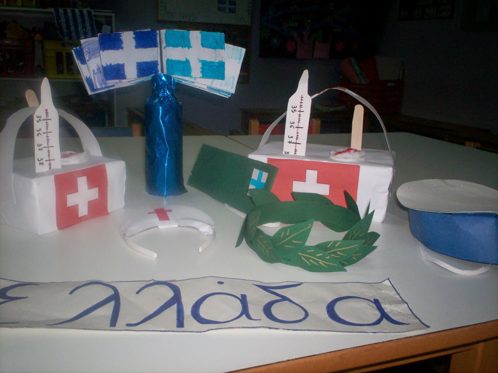 | Όλα έτοιμα για τη γιορτή της 28ης Οκτωβρίου(βαλιτσάκι νοσοκόμας με θερμόμετρο και άλλα ιατρικά εργαλεία, δάφνινο στεφάνι, πηλήκια, ναυτικά καπέλα κ.ά.) |