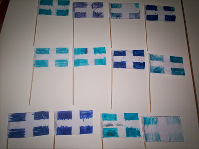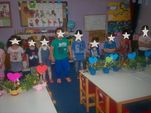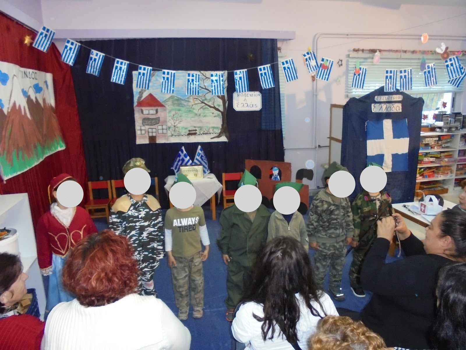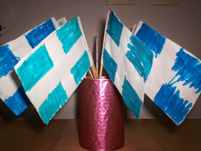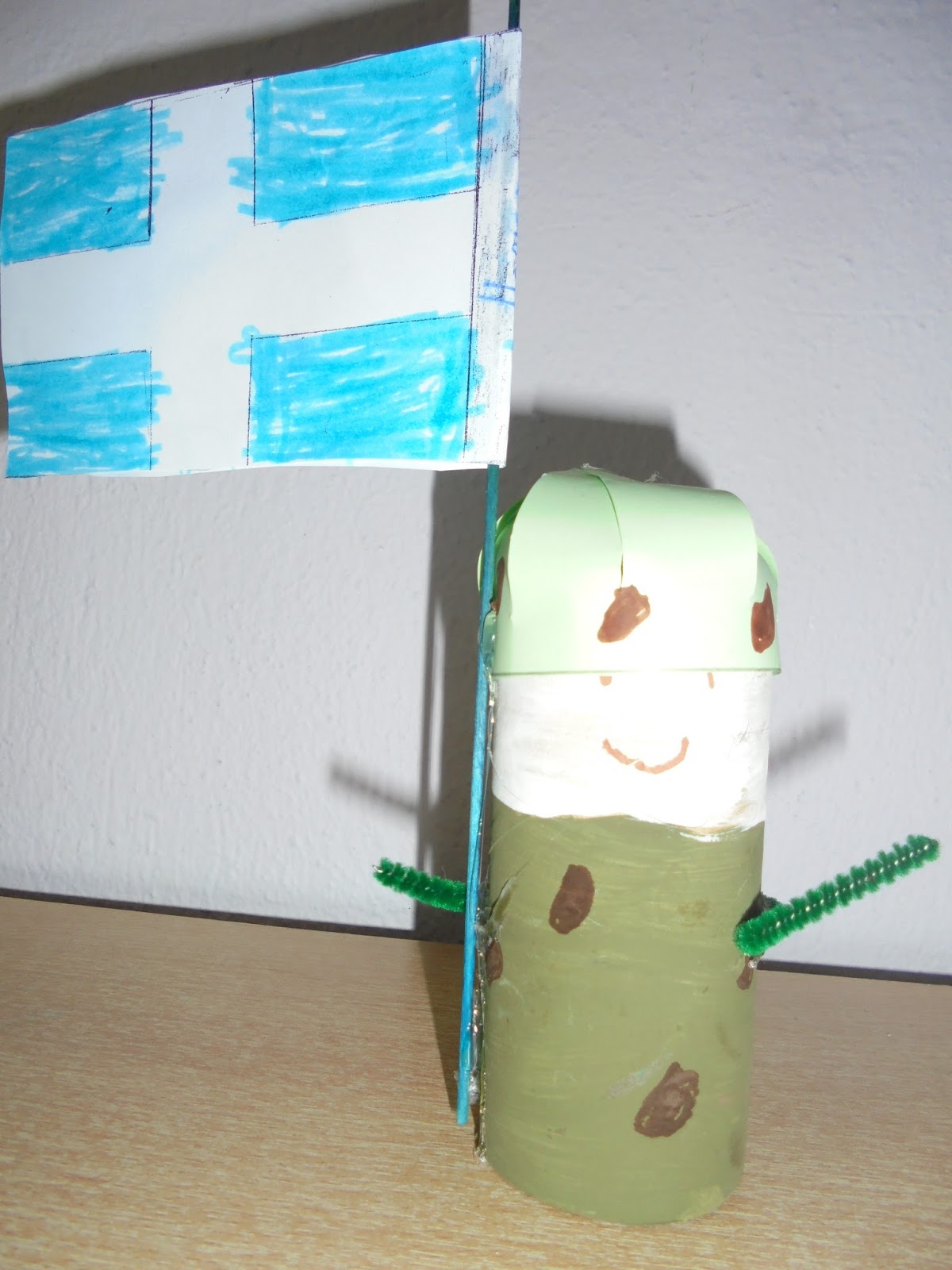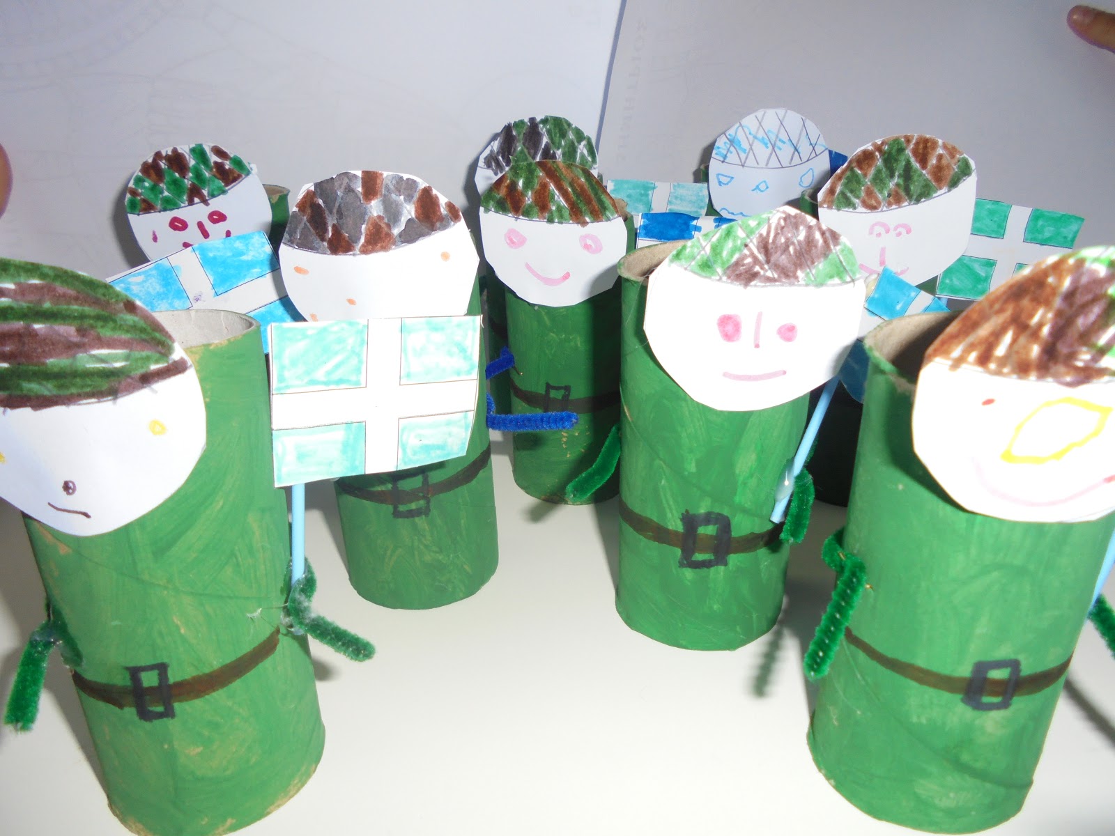 τα φανταράκια με την ελληνική σημαία στα χέρια τους(κατασκευή από τα παιδιά με ρολά και χαρτιά)