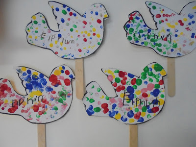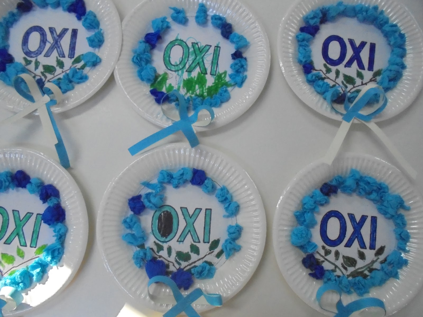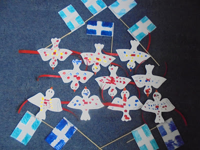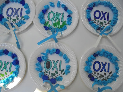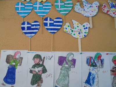 κάτω: σημαιάκια και περιστεράκια της ειρήνης -βραχιολάκια, οι κατασκευές μας για την 28η Οκτωβρίου