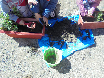 Κι εμείς τα γεμίσαμε με τα φτυαράκια μας με φρέσκο χώμα από τους μπαξέδες των σπιτιών μας και φυτέψαμε μαρουλάκια