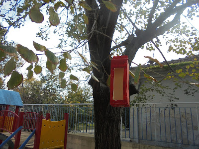 Σε μια γωνιά της αυλής μας κρεμάσαμε μια ταίστρα από κουτί γάλατος, αφού το βάψαμε, βάλαμε μέσα σιτάρι για τα πουλάκια που δεν θα βρίσκουν τροφή το χειμώνα