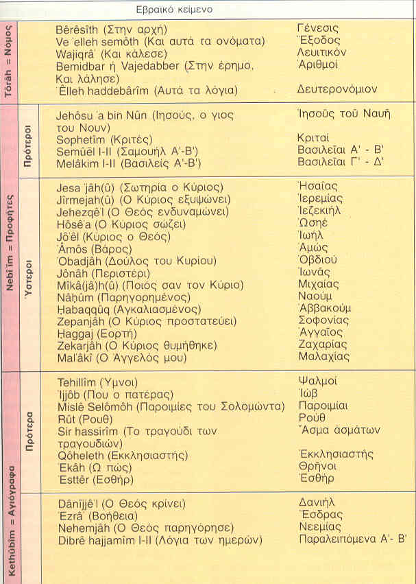 1. Εβραϊκή Βίβλος (Παλαιά Διαθήκη): Είναι μια συλλογή από ιερά βιβλία. Η συγκρότηση της συλλογής αυτής που είναι ένα είδος καταλόγου και ονομάζεται «κανόνας» ακολούθησε μια μακρόχρονη και πολύπλοκη πορεία που δεν είναι σε όλες της τις φάσεις γνωστή. Παρότι αρκετά βιβλία της Εβραϊκής Βίβλου, αποτελούν προϊόν συλλογής κειμένων, όπως λόγου χάρη το βιβλίο των «Ψαλμών» που είναι μια συλλογή ύμνων, προσευχών και άλλων ποιημάτων, οι απαρχές της συγκρότησης του «κανόνα» θα πρέπει να τοποθετηθεί τον 5ο αιώνα π.Χ., όπου ο ιερέας και γραμματέας της Ιουδαϊκής κοινότητας, η οποία μόλις είχε συγκροτηθεί μετά από την αιχμαλωσία της Βαβυλώνας, διαμορφώνει την συλλογή των βιβλίων του «Νόμου» (εβραϊκά Τορά) τη γνωστή ως «Πεντάτευχο». Παράλληλα με το «Νόμο» άρχισαν να αποκτούν κανονική ισχύ και συλλογές λόγων των προφητών ή έργων που αναφέρονταν στην δράση τους ή αποδίδονταν σ’ αυτούς, καθώς επίσης και ποιητικές συλλογές ή έργα που περιείχαν σοφά λόγια και ρήσεις κ.λ.π. Μάλιστα όπως μαρτυρεί ο πρόλογος της ελληνικής μετάφρασης ενός βιβλίου της Εβραϊκής Βίβλου, η «Σοφία Σειράχ», ήδη κατά τον 2ο αιώνα π.Χ. είχε συγκροτηθεί μια συλλογή από ιερά κείμενα του Ιουδαϊσμού, που περιλάμβανε τρεις ομάδες βιβλίων: «Νόμος», «Προφήτες» και «Πάτρια» ή «Λοιπά Βιβλία». Ιδού και η αναφορά: «Γι’ αυτό και ο παππούς μου, ο Ιησούς, ασχολήθηκε πάνω από όλα με τη μελέτη του νόμου, των προφητών και των άλλων πάτριων βιβλίων και εξοικειώθηκε με αυτά». Την ύπαρξη μιας ανάλογης συλλογής με τριμερή διαίρεση «Νόμος», «Προφήτες» και «Ψαλμοί»υπαινίσσεται και το δεύτερο ιερό βιβλίο του Χριστιανισμού, η Καινή Διαθήκη, στο Κατά Λουκά Ευαγγέλιο: «Αυτά εννοούσα με τα λόγια που σας έλεγα όταν ήμουν ακόμη μαζί σας, πως δηλαδή πρέπει να εκπληρωθούν όλα όσα είναι γραμμένα για μένα στο νόμο του Μωϋσή, στους προφήτες και τουςΨαλμούς» Λουκ. 24:44. Τελικά ο «κανόνας» της Εβραϊκής Βίβλου παίρνει την οριστική μορφή του το 90 μ.Χ. σε μια ραβινική σύνοδο στην πόλη Ιάμνεια της Παλαιστίνης. Ο «κανόνας» αυτός περιλαμβάνει 39 βιβλία που διαιρούνται σε 3 ομάδες: «Νόμος», «Προφήτες» και «Αγιόγραφα». Η γλώσσα στην οποία γράφτηκαν τα βιβλία της Εβραϊκής Βίβλου είναι η Εβραϊκή, εκτός από ορισμένα τμήματα των βιβλίων Δανιήλ και Έσδρας που είναι γραμμένα στα αραμαϊκά, την γλώσσα η οποία μετά τον 5ο αιώνα π.Χ. έγινε η καθομιλουμένη στο χώρο της Παλαιστίνης. Από τον 3ο αιώνα π.Χ., επειδή πολλοί Ιουδαίοι που ζούσαν εκτός της Παλαιστίνης και ιδιαίτερα στην Αλεξάνδρεια όπου υπήρχε μεγάλη και ακμάζουσα Εβραϊκή κοινότητα, είχαν λησμονήσει την μητρική τους γλώσσα, αρχίζει μια προσπάθεια μετάφρασης των βιβλίων της Εβραϊκής Βίβλου στα Ελληνικά, την διεθνή γλώσσα εκείνης της εποχής, που είναι γνωστή με την επωνυμία «μετάφραση των Εβδομήκοντα» ή «Ο΄», επειδή κατά την παράδοση την μετάφραση την ανέλαβαν να φέρουν εις πέρας 72 (λόγω στρογγυλοποίησης του αποκαλούμε Εβδομήκοντα) σοφοί Ιουδαίοι που γνώριζαν την Ελληνική. Ακολουθεί ο πίνακας με τα βιβλία της Εβραϊκής Βίβλου, πως αποκαλούνται στα Εβραϊκά και δίπλα πως μας είναι γνωστά σε εμάς: