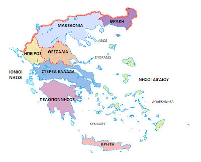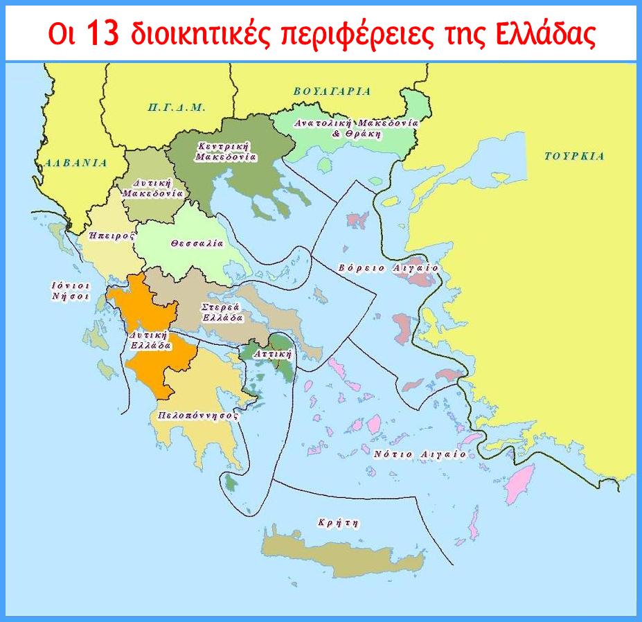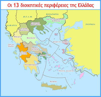 Η ηπειρωτική Ελλάδα χωρίζεται σε εννιά διοικητικές περιφέρειες και η νησιωτική Ελλάδα σε τέσσερις.