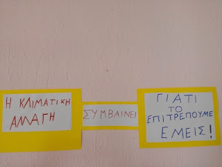 Φέτος, με τους μαθητές του Δ2, για να μην επαναλαμβανόμαστε, σταθήκαμε περισσότερο στην κλιματική αλλαγή, που οφείλεται τόσο σε ανθρώπινες δραστηριότητες όσο και και σε φυσικά αίτια. Αναφερθήκαμε στο σημαντικότερο φαινόμενο της κλιματικής αλλαγής, που είναι η αύξηση της θερμοκρασίας της Γης, η οποία δημιουργείται μέσω ενός μηχανισμού που ονομάζεται “φαινόμενο του θερμοκηπίου”. Ενημερωθήκαμε γι΄αυτή από πλούσιο εκπαιδευτικό υλικό στο διαδίκτυο, μάθαμε τις επιπτώσεις της στα καιρικά φαινόμενα, τη γεωργία, τα τρόφιμα, την υγεία και την υποβάθμιση και καταστροφή που μπορεί να επιφέρει στα οικοσυστήματα και τη βιοποικιλότητα.