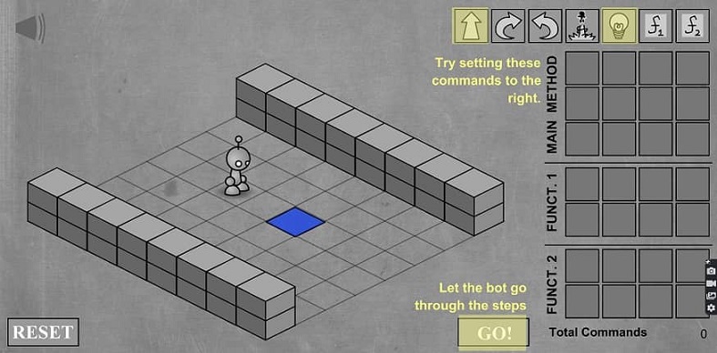 ), άλμα και άναμμα μίας λάμπας. Υπάρχει επίσης η δυνατότητα κλήσης δύο συναρτήσεων. Μια από τις δημοφιλέστερες εφαρμογές για εκμάθηση βασικών αρχών προγραμματισμού, παίζοντας. Κλικ στην εικόνα και μεγιστοποίηση του παραθύρου για καλύτερη εμπειρία (μοναδικό μειονέκτημα, το γεγονός ότι πλέον φιλοξενείται σε σελίδα με αρκετές διαφημίσεις): https://www.gameflare.com/online-game/light-bot/