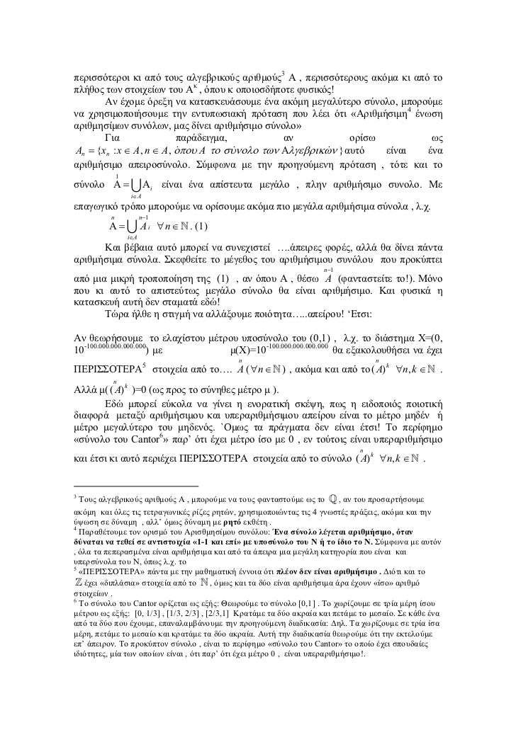 - 2. περισσότεροι κι από τους αλγεβρικούς αριθµούς3 Α , περισσότερους ακόµα κι από τοπλήθος των στοιχείων του Ακ , όπου κ οποιοσδήποτε φυσικός! Αν έχοµε όρεξη να κατασκευάσουµε ένα ακόµη µεγαλύτερο σύνολο, µπορούµενα χρησιµοποιήσουµε την εντυπωσιακή πρόταση που λέει ότι «Αριθµήσιµη4 ένωσηαριθµησίµων συνόλων, µας δίνει αριθµήσιµο σύνολο» Για παράδειγµα, αν ορίσω ως An = {xn : x ∈ A , n ∈ A , οπου A το συνολο των Αλγεβρικων } αυτό είναι ένααριθµήσιµο απειροσύνολο. Σύµφωνα µε την προηγούµενη πρόταση , τότε και το 1σύνολο Α = ∪ Αi είναι ένα απίστευτα µεγάλο , πλην αριθµήσιµο συνολο. Με i∈Aεπαγωγικό τρόπο µπορούµε να ορίσουµε ακόµα πιο µεγάλα αριθµήσιµα σύνολα , λ.χ. n n −1 Α = ∪ Ai ∀n ∈ . (1) i∈A Και βέβαια αυτό µπορεί να συνεχιστεί ….άπειρες φορές, αλλά θα δίνει πάντααριθµήσιµα σύνολα. Σκεφθείτε το µέγεθος του αριθµήσιµου συνόλου που προκύπτει n −1από µια µικρή τροποποίηση της (1) , αν όπου Α , θέσω A (φανταστείτε το!). Μόνοπου κι αυτό το απιστεύτως µεγάλο σύνολο θα είναι αριθµήσιµο. Και φυσικά ηκατασκευή αυτή δεν σταµατά εδώ! Τώρα ήλθε η στιγµή να αλλάξουµε ποιότητα…..απείρου! ‘Ετσι:Αν θεωρήσουµε το ελαχίστου µέτρου υποσύνολο του (0,1) , λ.χ. το διάστηµα Χ=(0,10-100.000.000.000.000) µε µ(Χ)=10-100.000.000.000.000 θα εξακολουθήσει να έχει n nΠΕΡΙΣΣΟΤΕΡΑ5 στοιχεία από το…. A ( ∀n ∈ ) , ακόµα και από το ( A) k ∀n, k ∈ . nΑλλά µ( ( A) k )=0 (ως προς το σύνηθες µέτρο µ ). Εδώ µπορεί εύκολα να γίνει η ενορατική σκέψη, πως η ειδοποιός ποιοτικήδιαφορά µεταξύ αριθµήσιµου και υπεραριθµήσιµου απείρου είναι το µέτρο µηδέν ήµέτρο µεγαλύτερο του µηδενός. `Οµως τα πράγµατα δεν είναι έτσι! Το περίφηµο«σύνολο του Cantor6» παρ’ ότι έχει µέτρο ίσο µε 0 , εν τούτοις είναι υπεραριθµήσιµο nκαι έτσι κι αυτό περιέχει ΠΕΡΙΣΣΟΤΕΡΑ στοιχεία από το σύνολο ( A) k ∀n, k ∈ .3 Τους αλγεβρικούς αριθµούς Α , µπορούµε να τους φανταστούµε ως το , αν του προσαρτήσουµεακόµη και όλες τις τετραγωνικές ρίζες ρητών, χρησιµοποιώντας τις 4 γνωστές πράξεις, ακόµα και τηνύψωση σε δύναµη , αλλ’ όµως δύναµη µε ρητό εκθέτη .4 Παραθέτουµε τον ορισµό του Αρισθµησίµου συνόλου: Ένα σύνολο λέγεται αριθµήσιµο, ότανδύναται να τεθεί σε αντιστοιχία «1-1 και επί» µε υποσύνολο του Ν ή το ίδιο το Ν. Σύµφωνα µε αυτόν, όλα τα πεπερασµένα είναι αριθµήσιµα και από τα άπειρα µια µεγάλη κατηγορία που είναι καιυπερσύνολα του Ν, όπως λ.χ. το5 «ΠΕΡΙΣΣΟΤΕΡΑ» πάντα µε την µαθηµατική έννοια ότι πλέον δεν είναι αριθµήσιµο . ∆ιότι και το έχει «διπλάσια» στοιχεία από το , όµως και τα δύο είναι αριθµήσιµα άρα έχουν «ίσο» αριθµόστοιχείων .6 Το σύνολο του Cantor ορίζεται ως εξής: Θεωρούµε το σύνολο [0,1] . Το χωρίζουµε σε τρία µέρη ίσουµέτρου ως εξής: [0, 1/3] , [1/3, 2/3] , [2/3,1] Κρατάµε τα δύο ακραία και πετάµε το µεσαίο. Σε κάθε ένααπό τα δύο που έχουµε, επαναλαµβάνουµε την προηγούµενη διαδικασία: ∆ηλ. Τα χωρίζουµε σε τρία ίσαµέρη, πετάµε το µεσαίο και κρατάµε τα δύο ακραία. Αυτή την διαδικασία θεωρούµε ότι την εκτελούµεεπ’ άπειρον. Το προκύπτον σύνολο , είναι το περίφηµο «σύνολο του Cantor» το οποίο έχει σπουδαίεςιδιότητες, µία των οποίων είναι , ότι παρ’ ότι έχει µέτρο 0 , είναι υπεραριθµήσιµο!.