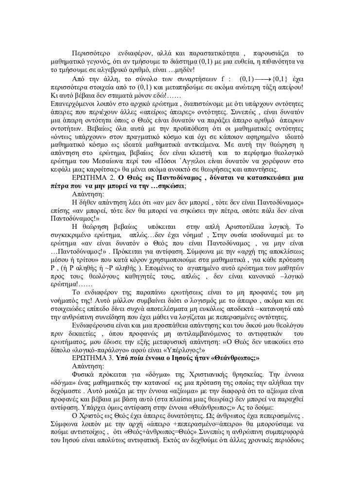 - 3. Περισσότερο ενδιαφέρον, αλλά και παραστατικότητα , παρουσιάζει τοµαθηµατικό γεγονός, ότι αν τµήσουµε το διάστηµα (0,1) µε µια ευθεία, η πιθανότητα νατο τµήσουµε σε αλγεβρικό αριθµό, είναι …µηδέν! Από την άλλη, το σύνολο των συναρτήσεων f : (0,1) {0,1} έχει→περισσότερα στοιχεία από το (0,1) και µεταπηδούµε σε ακόµα ανώτερη τάξη απείρου!Κι αυτό βέβαια δεν σταµατά µόνον εδώ!……Επανερχόµενοι λοιπόν στο αρχικό ερώτηµα , διαπιστώνοµε µε ότι υπάρχουν οντότητεςάπειρες που περιέχουν άλλες «απείρως άπειρες» οντότητες. Συνεπώς , είναι δυνατόνµια άπειρη οντότητα όπως ο Θεός είναι δυνατόν να παράξει άπειρο αριθµό άπειρωνοντοτήτων. Βεβαίως όλα αυτά µε την προϋπόθεση ότι οι µαθηµατικές οντότητες«όντως υπάρχουν» στον πραγµατικό κόσµο και όχι σε κάποιον αφηρηµένο ιδεατόµαθηµατικό κόσµο ως ιδεατά µαθηµατικά αντικείµενα. Με αυτή την θεώρηση ηαπάντηση στο ερώτηµα, βεβαίως δεν είναι κλειστή και το περίφηµο θεολογικόερώτηµα του Μεσαίωνα περί του «Πόσοι `Αγγελοι είναι δυνατόν να χορέψουν στοκεφάλι µιας καρφίτσας» θα µένει ακόµα ανοικτό σε θεωρήσεις και απαντήσεις. ΕΡΩΤΗΜΑ 2. Ο Θεός ως Παντοδύναµος , δύναται να κατασκευάσει µιαπέτρα που να µην µπορεί να την …σηκώσει; Απάντηση: Η δήθεν απάντηση λέει ότι «αν µεν δεν µπορεί , τότε δεν είναι Παντοδύναµος»επίσης «αν µπορεί, τότε δεν θα µπορεί να σηκώσει την πέτρα, οπότε πάλι δεν είναιΠαντοδύναµος!» Η θεώρηση βεβαίως υπόκειται στην απλή Αριστοτέλεια λογική. Τοσυγκεκριµένο ερώτηµα, απλώς…δεν έχει νόηµα! , Στην ουσία ισοδυναµεί µε τοερώτηµα «αν είναι δυνατόν ο Θεός που είναι Παντοδύναµος , να µην είναι…Παντοδύναµος!» . Πρόκειται για αντίφαση. Σύµφωνα µε την «αρχή της αποκλίσεωςµέσου ή τρίτου» που κατά κόρον χρησιµοποιούµε στα µαθηµατικά , για κάθε πρότασηP , (ή Ρ αληθής ή ~Ρ αληθής ). Εποµένως το αγαπηµένο αυτό ερώτηµα των µαθητώνπρος τους θεολόγους καθηγητές τους, απλώς , δεν είναι κανονικό –λογικόερώτηµα!…… Το ενδιαφέρον της παραπάνω ερωτήσεως είναι το µη προφανές του µηνοήµατός της! Αυτό µάλλον συµβαίνει διότι ο λογισµός µε το άπειρο , ακόµα και σεστοιχειώδες επίπεδο δίνει συχνά αποτελέσµατα µη ευκόλως αποδεκτά –κατανοητά απότην ανθρώπινη συνείδηση που έχει µάθει να λογίζεται µε πεπερασµένες οντότητες. Ενδιαφέρουσα είναι και µια προσπάθεια απάντησης και του δικού µου θεολόγουπριν δεκαετίες , όπου προφανώς µη αντιλαµβανόµενος το αντιφατικόν τουερωτήµατος, µου έδωσε την εξής µεταφυσική απάντηση: «Ο Θεός δεν υπακούει στοδίπολο «λογικό-παράλογο» αφού είναι «Υπέρλογος!» ΕΡΩΤΗΜΑ 3. Υπό ποία έννοια ο Ιησούς ήταν «Θεάνθρωπος;» Απάντηση: Φυσικά πρόκειται για «δόγµα» της Χριστιανικής θρησκείας. Την έννοια«δόγµα» ένας µαθηµατικός την κατανοεί ως µια πρόταση της οποίας την αλήθεια τηνδεχόµαστε . Αυτό µοιάζει µε την έννοια «αξίωµα» µε την διαφορά ότι το αξίωµα είναιπροφανές και βέβαια µε βάση αυτό (στα πλαίσια µιας θεωρίας) δεν µπορεί να παραχθείαντίφαση. Υπάρχει όµως αντίφαση στην έννοια «Θεάνθρωπος;» Ας το δούµε: Ο Χριστός ως Θεός έχει άπειρες δυνατότητες. Ως άνθρωπος έχει πεπερασµένες .Σύµφωνα λοιπόν µε την αρχή «άπειρο +πεπερασµένο=άπειρο» θα µπορούσαµε ναπούµε αντιστοίχως , ότι «Θεός+άνθρωπος=Θεός» Συνεπώς η ανθρώπινη συµπεριφοράτου Ιησού είναι απολύτως αντιφατική. Εκτός αν δεχθούµε ότι άλλες χρονικές περιόδους