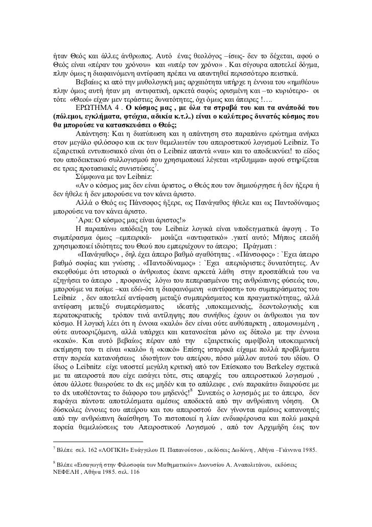 - 4. ήταν Θεός και άλλες άνθρωπος. Αυτό ένας θεολόγος –ίσως- δεν το δέχεται, αφού οΘεός είναι «πέραν του χρόνου» και «υπέρ τον χρόνο» . Και σίγουρα αποτελεί δόγµα,πλην όµως η διαφαινόµενη αντίφαση πρέπει να απαντηθεί περισσότερο πειστικά. Βεβαίως κι από την µυθολογική µας αρχαιότητα υπήρχε η έννοια του «ηµιθέου»πλην όµως αυτή ήταν µη αντιφατική, αρκετά σαφώς ορισµένη και –το κυριότερο- οιτότε «Θεοί» είχαν µεν τεράστιες δυνατότητες, όχι όµως και άπειρες !…. ΕΡΩΤΗΜΑ 4 . Ο κόσµος µας , µε όλα τα στραβά του και τα ανάποδά του(πόλεµοι, εγκλήµατα, φτώχια, αδικία κ.τ.λ.) είναι ο καλύτερος δυνατός κόσµος πουθα µπορούσε να κατασκευάσει ο Θεός; Απάντηση: Και η διατύπωση και η απάντηση στο παραπάνω ερώτηµα ανήκειστον µεγάλο φιλόσοφο και εκ των θεµελιωτών του απειροστικού λογισµού Leibniz. Toεξαιρετικά εντυπωσιακό είναι ότι ο Leibniz απαντά «ναι» και το αποδεικνύει! το είδοςτου αποδεικτικού συλλογισµού που χρησιµοποιεί λέγεται «τρίληµµα» αφού στηρίζεταισε τρεις προτασιακές συνιστώσες7. Σύµφωνα µε τον Leibniz: «Αν ο κόσµος µας δεν είναι άριστος, ο Θεός που τον δηµιούργησε ή δεν ήξερα ήδεν ήθελε ή δεν µπορούσε να τον κάνει άριστο. Αλλά ο Θεός ως Πάνσοφος ήξερε, ως Πανάγαθος ήθελε και ως Παντοδύναµοςµπορούσε να τον κάνει άριστο. `Αρα: Ο κόσµος µας είναι άριστος!» Η παραπάνω απόδειξη του Leibniz λογικά είναι υποδειγµατικά άψογη . Τοσυµπέρασµα όµως –εµπειρικά- µοιάζει «αντιφατικό» .γιατί αυτό; Μήπως επειδήχρησιµοποιεί ιδιότητες του Θεού που εµπεριέχουν το άπειρο; Πράγµατι : «Πανάγαθος» , δηλ έχει άπειρο βαθµό αγαθότητας . «Πάνσοφος» : `Εχει άπειροβαθµό σοφίας και γνώσης . «Παντοδύναµος» : `Εχει απεριόριστες δυνατότητες. Ανσκεφθούµε ότι ιστορικά ο άνθρωπος έκανε αρκετά λάθη στην προσπάθειά του ναεξηγήσει το άπειρο , προφανώς λόγω του πεπερασµένου της ανθρώπινης φύσεώς του,µπορούµε να πούµε –και εδώ-ότι η διαφαινόµενη «αντίφαση» του συµπεράσµατος τουLeibniz , δεν αποτελεί αντίφαση µεταξύ συµπεράσµατος και πραγµατικότητας, αλλάαντίφαση µεταξύ συµπεράσµατος ιδεατής ,υποκειµενικής, δεοντολογικής καιπερατοκρατικής τρόπον τινά αντίληψης που συνήθως έχουν οι άνθρωποι για τονκόσµο. Η λογική λέει ότι η έννοια «καλό» δεν είναι ούτε αυθύπαρκτη , αποµονωµένη ,ούτε αυτοοριζόµενη, αλλά υπάρχει και κατανοείται µόνο ως δίπολο µε την έννοια«κακό». Και αυτό βεβαίως πέραν από την εξαιρετικώς αµφίβολη υποκειµενικήεκτίµηση του τι είναι «καλό» ή «κακό» Επίσης ιστορικά είχαµε πολλά προβλήµαταστην πορεία κατανοήσεως ιδιοτήτων του απείρου, πόσο µάλλον αυτού του ιδίου. Οίδιος ο Leibnitz είχε υποστεί µεγάλη κριτική από τον Επίσκοπο του Berkeley σχετικάµε τα απειροστά που είχε εισάγει τότε, στις απαρχές του απειροστικού λογισµού ,όπου άλλοτε θεωρούσε το dx ως µηδέν και το απάλειφε , ενώ παρακάτω διαιρούσε µετο dx υποθέτοντας το διάφορο του µηδενός!8 Συνεπώς ο λογισµός µε το άπειρο, δενπαράγει πάντοτε αποτελέσµατα αµέσως αποδεκτά από την ανθρώπινη νόηση. Οιδύσκολες έννοιες του απείρου και του απειροστού δεν γίνονται αµέσως κατανοητέςαπό την ανθρώπινη διαίσθηση. Το πιστοποιεί η λίαν ενδιαφέρουσα και πολύ µακράπορεία θεµελιώσεως του Απειροστικού Λογισµού , από τον Αρχιµήδη έως τον7 Βλέπε σελ. 162 «ΛΟΓΙΚΗ» Ευάγγελου Π. Παπανούτσου , εκδόσεις ∆ωδώνη , Αθήνα –Γιάννινα 1985.8 Βλέπε «Εισαγωγή στην Φιλοσοφία των Μαθηµατικών» ∆ιονυσίου Α. Αναπολιτάνου, εκδόσειςΝΕΦΕΛΗ , Αθήνα 1985. σελ. 116
