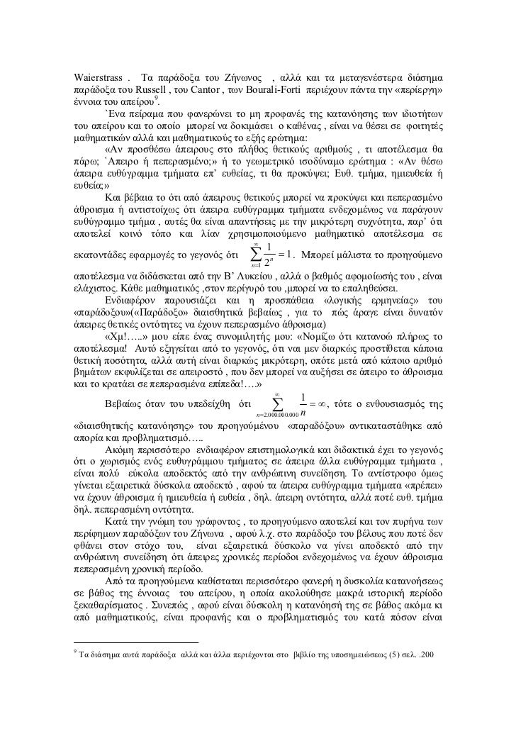 - 5. Waierstrass . Τα παράδοξα του Ζήνωνος , αλλά και τα µεταγενέστερα διάσηµαπαράδοξα του Russell , του Cantor , των Bourali-Forti περιέχουν πάντα την «περίεργη»έννοια του απείρου9. `Ενα πείραµα που φανερώνει το µη προφανές της κατανόησης των ιδιοτήτωντου απείρου και το οποίο µπορεί να δοκιµάσει ο καθένας , είναι να θέσει σε φοιτητέςµαθηµατικών αλλά και µαθηµατικούς το εξής ερώτηµα: «Αν προσθέσω άπειρους στο πλήθος θετικούς αριθµούς , τι αποτέλεσµα θαπάρω; `Απειρο ή πεπερασµένο;» ή το γεωµετρικό ισοδύναµο ερώτηµα : «Αν θέσωάπειρα ευθύγραµµα τµήµατα επ’ ευθείας, τι θα προκύψει; Ευθ. τµήµα, ηµιευθεία ήευθεία;» Και βέβαια το ότι από άπειρους θετικούς µπορεί να προκύψει και πεπερασµένοάθροισµα ή αντιστοίχως ότι άπειρα ευθύγραµµα τµήµατα ενδεχοµένως να παράγουνευθύγραµµο τµήµα , αυτές θα είναι απαντήσεις µε την µικρότερη συχνότητα, παρ’ ότιαποτελεί κοινό τόπο και λίαν χρησιµοποιούµενο µαθηµατικό αποτέλεσµα σε ∞ 1εκατοντάδες εφαρµογές το γεγονός ότι ∑2 n =1 n = 1 . Μπορεί µάλιστα το προηγούµενοαποτέλεσµα να διδάσκεται από την Β’ Λυκείου , αλλά ο βαθµός αφοµοίωσής του , είναιελάχιστος. Κάθε µαθηµατικός ,στον περίγυρό του ,µπορεί να το επαληθεύσει. Ενδιαφέρον παρουσιάζει και η προσπάθεια «λογικής ερµηνείας» του«παράδοξου»(«Παράδοξο» διαισθητικά βεβαίως , για το πώς άραγε είναι δυνατόνάπειρες θετικές οντότητες να έχουν πεπερασµένο άθροισµα) «Χµ!…..» µου είπε ένας συνοµιλητής µου: «Νοµίζω ότι κατανοώ πλήρως τοαποτέλεσµα! Αυτό εξηγείται από το γεγονός, ότι ναι µεν διαρκώς προστίθεται κάποιαθετική ποσότητα, αλλά αυτή είναι διαρκώς µικρότερη, οπότε µετά από κάποιο αριθµόβηµάτων εκφυλίζεται σε απειροστό , που δεν µπορεί να αυξήσει σε άπειρο το άθροισµακαι το κρατάει σε πεπερασµένα επίπεδα!….» ∞ 1 Βεβαίως όταν του υπεδείχθη ότι ∑ n = ∞ , τότε ο ενθουσιασµός της n = 2.000.000.000«διαισθητικής κατανόησης» του προηγούµένου «παραδόξου» αντικαταστάθηκε απόαπορία και προβληµατισµό….. Ακόµη περισσότερο ενδιαφέρον επιστηµολογικά και διδακτικά έχει το γεγονόςότι ο χωρισµός ενός ευθυγράµµου τµήµατος σε άπειρα άλλα ευθύγραµµα τµήµατα ,είναι πολύ εύκολα αποδεκτός από την ανθρώπινη συνείδηση. Το αντίστροφο όµωςγίνεται εξαιρετικά δύσκολα αποδεκτό , αφού τα άπειρα ευθύγραµµα τµήµατα «πρέπει»να έχουν άθροισµα ή ηµιευθεία ή ευθεία , δηλ. άπειρη οντότητα, αλλά ποτέ ευθ. τµήµαδηλ. πεπερασµένη οντότητα. Κατά την γνώµη του γράφοντος , το προηγούµενο αποτελεί και τον πυρήνα τωνπερίφηµων παραδόξων του Ζήνωνα , αφού λ.χ. στο παράδοξο του βέλους που ποτέ δενφθάνει στον στόχο του, είναι εξαιρετικά δύσκολο να γίνει αποδεκτό από τηνανθρώπινη συνείδηση ότι άπειρες χρονικές περίοδοι ενδεχοµένως να έχουν άθροισµαπεπερασµένη χρονική περίοδο. Από τα προηγούµενα καθίσταται περισσότερο φανερή η δυσκολία κατανοήσεωςσε βάθος της έννοιας του απείρου, η οποία ακολούθησε µακρά ιστορική περίοδοξεκαθαρίσµατος . Συνεπώς , αφού είναι δύσκολη η κατανόησή της σε βάθος ακόµα κιαπό µαθηµατικούς, είναι προφανής και ο προβληµατισµός του κατά πόσον είναι9 Τα διάσηµα αυτά παράδοξα αλλά και άλλα περιέχονται στο βιβλίο της υποσηµειώσεως (5) σελ. .200