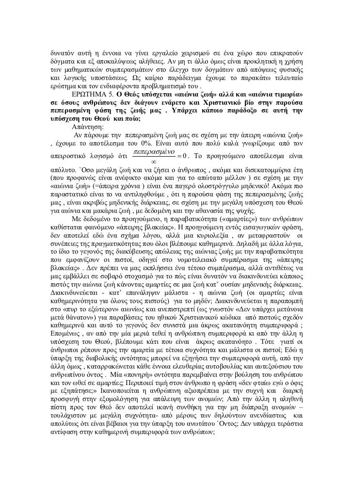 - 6. δυνατόν αυτή η έννοια να γίνει εργαλείο χειρισµού σε ένα χώρο που επικρατούνδόγµατα και εξ αποκαλύψεως αλήθειες. Αν µη τι άλλο όµως είναι προκλητική η χρήσητων µαθηµατικών συµπερασµάτων στο έλεγχο των δογµάτων από απόψεως φυσικήςκαι λογικής υποστάσεως. Ως καίριο παράδειγµα έχουµε το παρακάτω τελευταίοερώτηµα και τον ενδιαφέροντα προβληµατισµό του . ΕΡΩΤΗΜΑ 5. Ο Θεός υπόσχεται «αιώνια ζωή» αλλά και «αιώνια τιµωρία»σε όσους ανθρώπους δεν διάγουν ενάρετο και Χριστιανικό βίο στην παρούσαπεπερασµένη φάση της ζωής µας . Υπάρχει κάποιο παράδοξο σε αυτή τηνυπόσχεση του Θεού και ποίο; Απάντηση: Αν πάρουµε την πεπερασµένη ζωή µας σε σχέση µε την άπειρη «αιώνια ζωή», έχουµε το αποτέλεσµα του 0%. Είναι αυτό που πολύ καλά γνωρίζουµε από τον πεπερασµενοαπειροστικό λογισµό ότι = 0 . Το προηγούµενο αποτέλεσµα είναι ∞απόλυτο. `Οσο µεγάλη ζωή και να ζήσει ο άνθρωπος , ακόµα και δισεκατοµµύρια έτη(που προφανώς είναι ανέφικτο ακόµα και για το απώτατο µέλλον ) σε σχέση µε την«αιώνια ζωή» (=άπειρα χρόνια ) είναι ένα παγερό ολοστρόγγυλο µηδενικό! Ακόµα πιοπαραστατικό είναι το να αντιληφθούµε , ότι η παρούσα φάση της πεπερασµένης ζωήςµας , είναι ακριβώς µηδενικής διάρκειας, σε σχέση µε την µεγάλη υπόσχεση του Θεούγια αιώνια και µακάρια ζωή , µε δεδοµένη και την αθανασία της ψυχής. Με δεδοµένο το προηγούµενο, η παραβατικότητα («αµαρτίες») των ανθρώπωνκαθίσταται φαινόµενο «άπειρης βλακείας». Η προηγούµενη εντός εισαγωγικών φράση,δεν αποτελεί εδώ ένα σχήµα λόγου, αλλά µια κυριολεξία , αν µεταφραστούν οισυνέπειες της πραγµατικότητας που όλοι βλέπουµε καθηµερινά. ∆ηλαδή µε άλλα λόγια,το ίδιο το γεγονός της διακύβευσης απώλειας της αιώνιας ζωής µε την παραβατικότηταπου εµφανίζουν οι πιστοί, οδηγεί στο νοµοτελειακό συµπέρασµα της «άπειρηςβλακείας» . ∆εν πρέπει να µας εκπλήσσει ένα τέτοιο συµπέρασµα, αλλά αντιθέτως ναµας εµβάλλει σε σοβαρό στοχασµό για το πώς είναι δυνατόν να διακινδυνεύει κάποιοςπιστός την αιώνια ζωή κάνοντας αµαρτίες σε µια ζωή κατ’ ουσίαν µηδενικής διάρκειας.∆ιακινδυνεύεται – κατ’ επανάληψιν µάλιστα – η αιώνια ζωή (οι αµαρτίες είναικαθηµερινότητα για όλους τους πιστούς) για το µηδέν; ∆ιακινδυνεύεται η παραποµπήστο «πυρ το εξώτερον» αιωνίως και ανεπιστρεπτί (ως γνωστόν «∆εν υπάρχει µετάνοιαµετά θάνατον») για παραβάσεις του ηθικού Χριστιανικού κώδικα από πιστούς σχεδόνκαθηµερινά και αυτό το γεγονός δεν συνιστά µια άκρως ακατανόητη συµπεριφορά ;Εποµένως , αν από την µία µεριά τεθεί η ανθρώπινη συµπεριφορά κι από την άλλη ηυπόσχεση του Θεού, βλέπουµε κάτι που είναι άκρως ακατανόητο . Τότε γιατί οιάνθρωποι ρέπουν προς την αµαρτία µε τέτοια συχνότητα και µάλιστα οι πιστοί; Εδώ ηύπαρξη της διαβολικής οντότητας µπορεί να εξηγήσει την συµπεριφορά αυτή, από τηνάλλη όµως , καταρρακώνεται κάθε έννοια ελευθερίας αυτοβουλίας και αυτεξούσιου τουανθρωπίνου όντος . Μία «πονηρή» οντότητα παρεµβαίνει στην βούληση του ανθρώπουκαι τον ωθεί σε αµαρτίες; Περιποιεί τιµή στον άνθρωπο η φράση «δεν φταίω εγώ ο όφιςµε εξηπάτησε;» Ικανοποιείται η ανθρώπινη αξιοπρέπεια µε την συχνή και διαρκήπροσφυγή στην εξοµολόγηση για απάλειψη των ανοµιών; Από την άλλη η αληθινήπίστη προς τον Θεό δεν αποτελεί ικανή συνθήκη για την µη διάπραξη ανοµιών –τουλάχιστον µε µεγάλη συχνότητα- από µέρους των δηλούντων ανενδίαστως καιαπολύτως ότι είναι βέβαιοι για την 