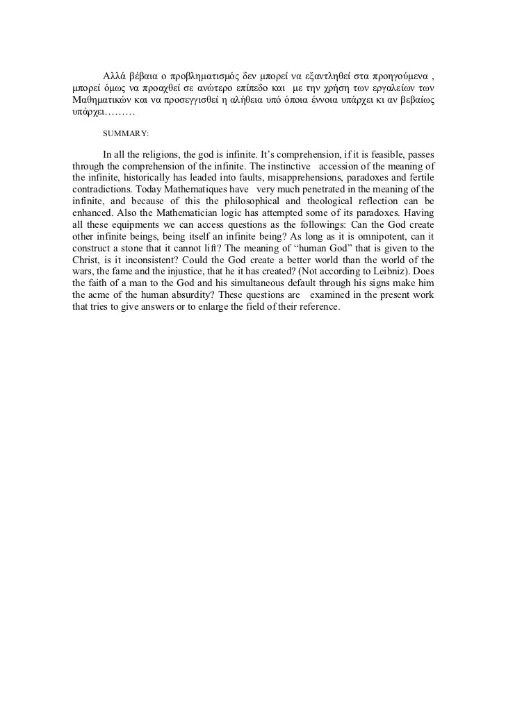 - 7. Αλλά βέβαια ο προβληµατισµός δεν µπορεί να εξαντληθεί στα προηγούµενα ,µπορεί όµως να προαχθεί σε ανώτερο επίπεδο και µε την χρήση των εργαλείων τωνΜαθηµατικών και να προσεγγισθεί η αλήθεια υπό όποια έννοια υπάρχει κι αν βεβαίωςυπάρχει……… SUMMARY: In all the religions, the god is infinite. It’s comprehension, if it is feasible, passesthrough the comprehension of the infinite. The instinctive accession of the meaning ofthe infinite, historically has leaded into faults, misapprehensions, paradoxes and fertilecontradictions. Today Mathematiques have very much penetrated in the meaning of theinfinite, and because of this the philosophical and theological reflection can beenhanced. Also the Mathematician logic has attempted some of its paradoxes. Havingall these equipments we can access questions as the followings: Can the God createother infinite beings, being itself an infinite being? As long as it is omnipotent, can itconstruct a stone that it cannot lift? The meaning of “human God” that is given to theChrist, is it inconsistent? Could the God create a better world than the world of thewars, the fame and the injustice, that he it has created? (Not according to Leibniz). Doesthe faith of a man to the God and his simultaneous default through his signs make himthe acme of the human absurdity? These questions are examined in the present workthat tries to give answers or to enlarge the field of their reference.