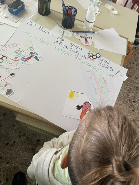 Η ημέρα ξεκίνησε με προβολή βίντεο από Έλληνες Ολυμπιονίκες, που μίλησαν στα παιδιά για τις αξίες του αθλητισμού, τη δύναμη της προσπάθειας και τη σημασία του να αγωνίζεσαι δίκαια και με σεβασμό. Εμπνευσμένοι από τα μηνύματα των αθλητών, οι μαθητές/τριες δημιούργησαν ένα όμορφο ομαδικό κολλάζ, γεμάτο χρώματα και συνθήματα, το οποία παρουσίασαν με ιδιαίτερη περηφάνια.