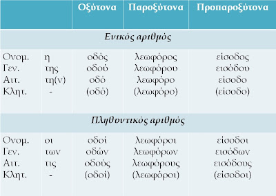 Όσα στην ονομαστική πτώση τονίζονται στη λήγουσα ή στην παραλήγουσα δεν μετακινούν τον τόνο στις άλλες πτώσεις. Αυτά που στην ονομαστική ενικού τονίζονται στην πρόπαραληγουσα, κατεβάζουν τον τόνο στην παραλήγουσα στη γενική του ενικού και στη γενική και στην αιτιατική του πληθυντικού: π.χ.η είσοδος-των εισόδων, τις εισόδους .