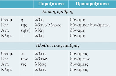 Βλέπουμε στο παράδειγμα ότι στη γενική ενικού σχηματίζονται δύο τύποι : π.χ. η λέξη, της λέξης και της λέξεως.