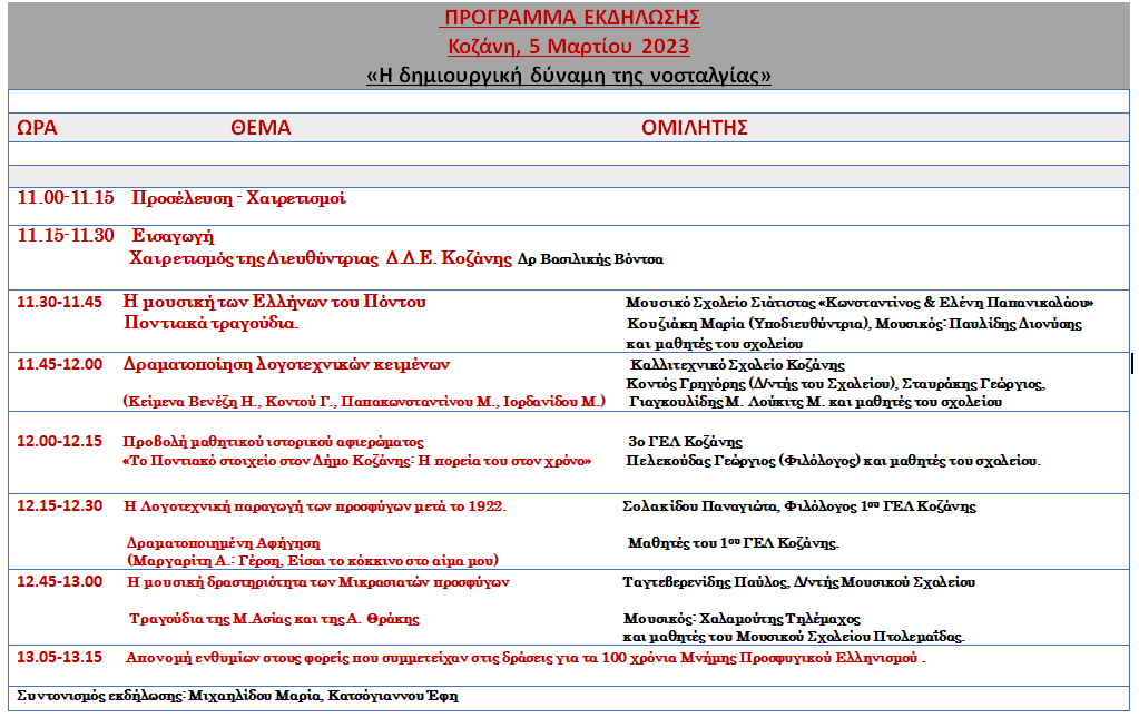 Η εκδήλωση εντάσσεται στο πλαίσιο της Τελετής Λήξης του Επετειακού Έτους «100 χρόνια Μνήμης Προσφυγικού Ελληνισμού Δήμου Κοζάνης», η οποία συνδιοργανώνεται από τον Δήμο Κοζάνης, τη Διεύθυνση Δευτεροβάθμιας Εκπαίδευσης Π.Ε. Κοζάνης και τον Μικρασιατικό Σύλλογο Π.Ε. Κοζάνης.