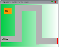 Κάντε πρώτα κλικ εδώ και μελετήστε την ομαλή κίνηση αντικειμένου στο scratch. Στη συνέχεια κατεβάστε το αρχείο που θα χρειαστείτε κάνοντας κλικ εδώ. Αφού το αποθηκεύσετε στο φάκελο της τάξης σας, ανοίξτε το και συμπληρώστε τις κατάλληλες εντολές ώστε το αυτοκινητάκι να φτάσει στο τέρμα της πίστας. Έπειτα μπορείτε να ανοίξετε ένα νέο αρχείο στο scratch, να φτιάξετε τη δική σας πίστα και να οδηγήσετε τη δική σας μορφή στο τέλος της πίστας σας.