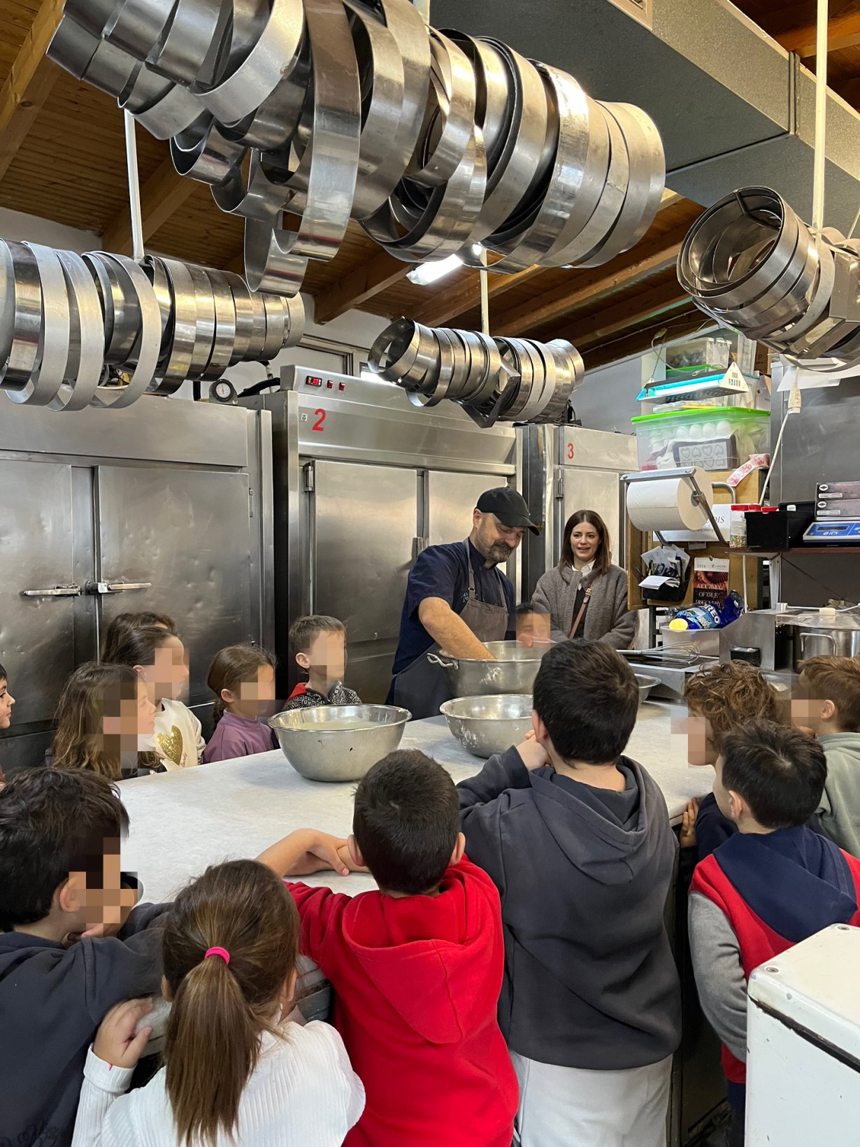 Στον χώρο μάς υποδέχτηκε θερμά ο υπεύθυνος ζαχαροπλάστης κ. Γιάννης Μπούσιας, ο οποίος παρουσίασε στους μαθητές τη διαδικασία παραγωγής των μπισκότων. Τα παιδιά δεν περιορίστηκαν μόνο στην παρατήρηση, αλλά συμμετείχαν ενεργά στη διαδικασία: ήρθαν σε επαφή με τη ζύμη, χρησιμοποίησαν τον πλάστη και κουπάτ, διακόσμησαν τα μπισκότα τους με σοκολάτα, ενώ ο κ. Μπούσιας τους έδειξε πώς να γράφουν τα ονόματά τους με σοκολάτα, δίνοντάς τους την ευκαιρία να το δοκιμάσουν και οι ίδιοι.
