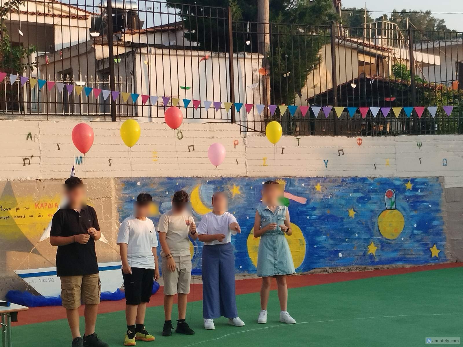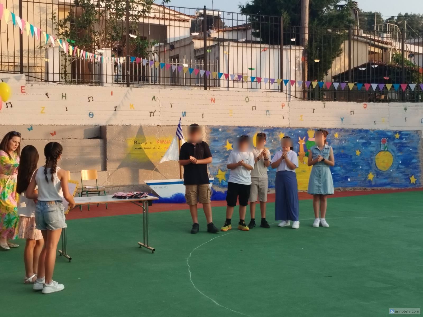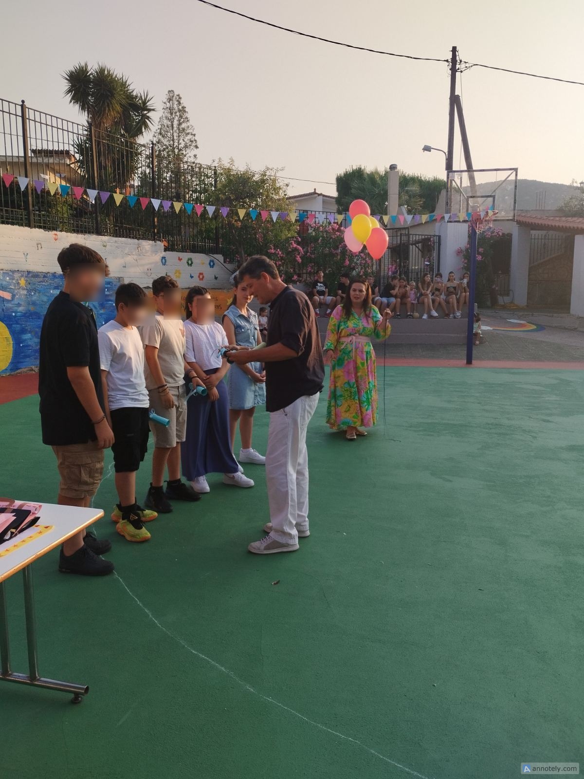 Αμέσως μετά, πραγματοποιήθηκε η αποφοίτηση της ΣΤ’ τάξης, μια ξεχωριστή στιγμή γεμάτη συγκίνηση. Οι μαθητές αποχαιρέτησαν το Δημοτικό τους, παραλαμβάνοντας αναμνηστικά δώρα από τον Σύλλογο Γονέων και Κηδεμόνων. Συμβολικά, άφησαν μπαλόνια να πετάξουν στον ουρανό, γεμίζοντας τον χώρο με χρώμα και συναισθήματα.