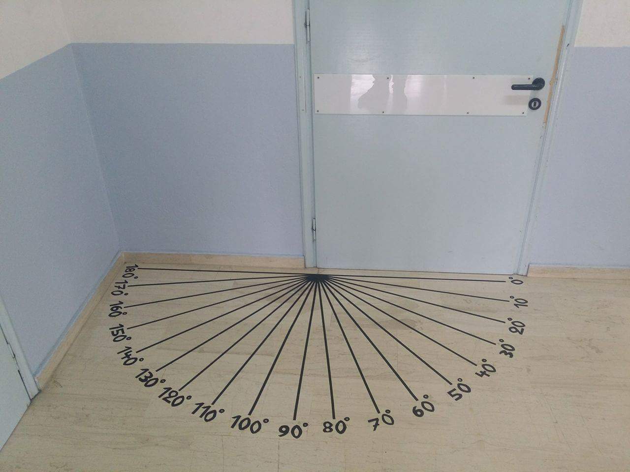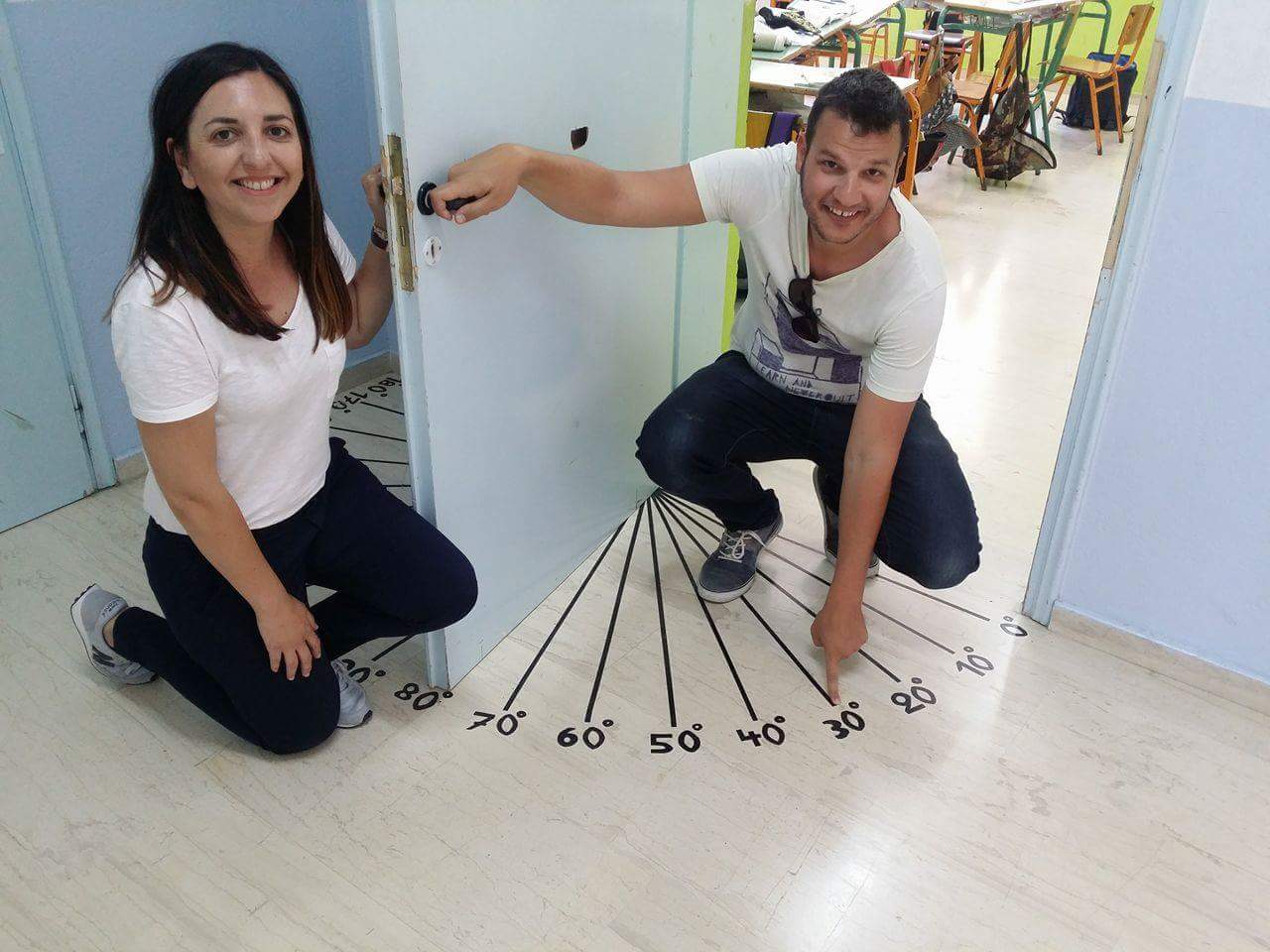 Η αίθουσα της Στ τάξης πλέον έχει ένα επιδαπέδιο μοιρογνωμόνιο στην πόρτα της. Η δασκάλα της Στ και ο καθηγητής των εικαστικών συνεργάστηκαν για αυτό το αποτέλεσμα.