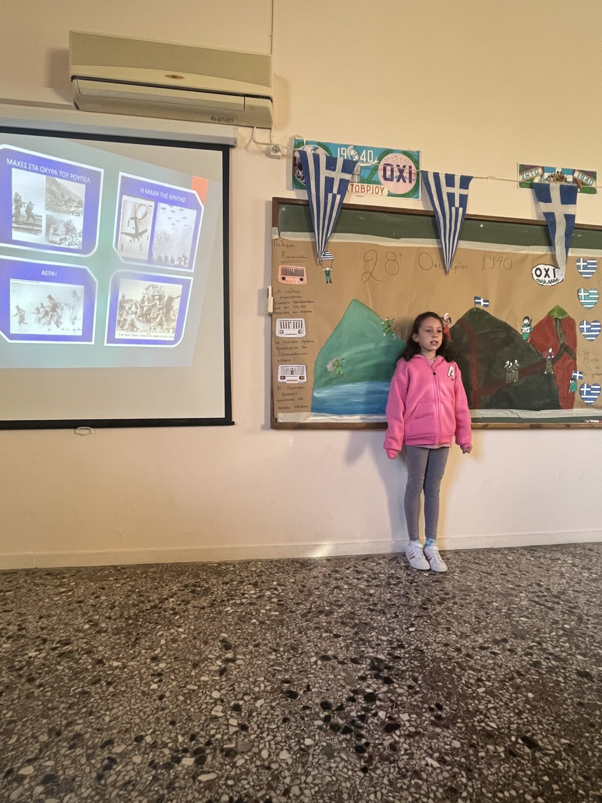 Την Παρασκευή 25 Οκτωβρίου, διοργανώθηκε στο σχολείο μας μια πολύ συγκινητική γιορτή για την επέτειο της 28ης Οκτωβρίου 1940. Την γιορτή παρουσίασαν οι μαθητές και οι μαθήτριες της Δ’ τάξης, καθώς την προετοιμασία της είχε αναλάβει ο δάσκαλος του τμήματος, κ. Δελής Παύλος.