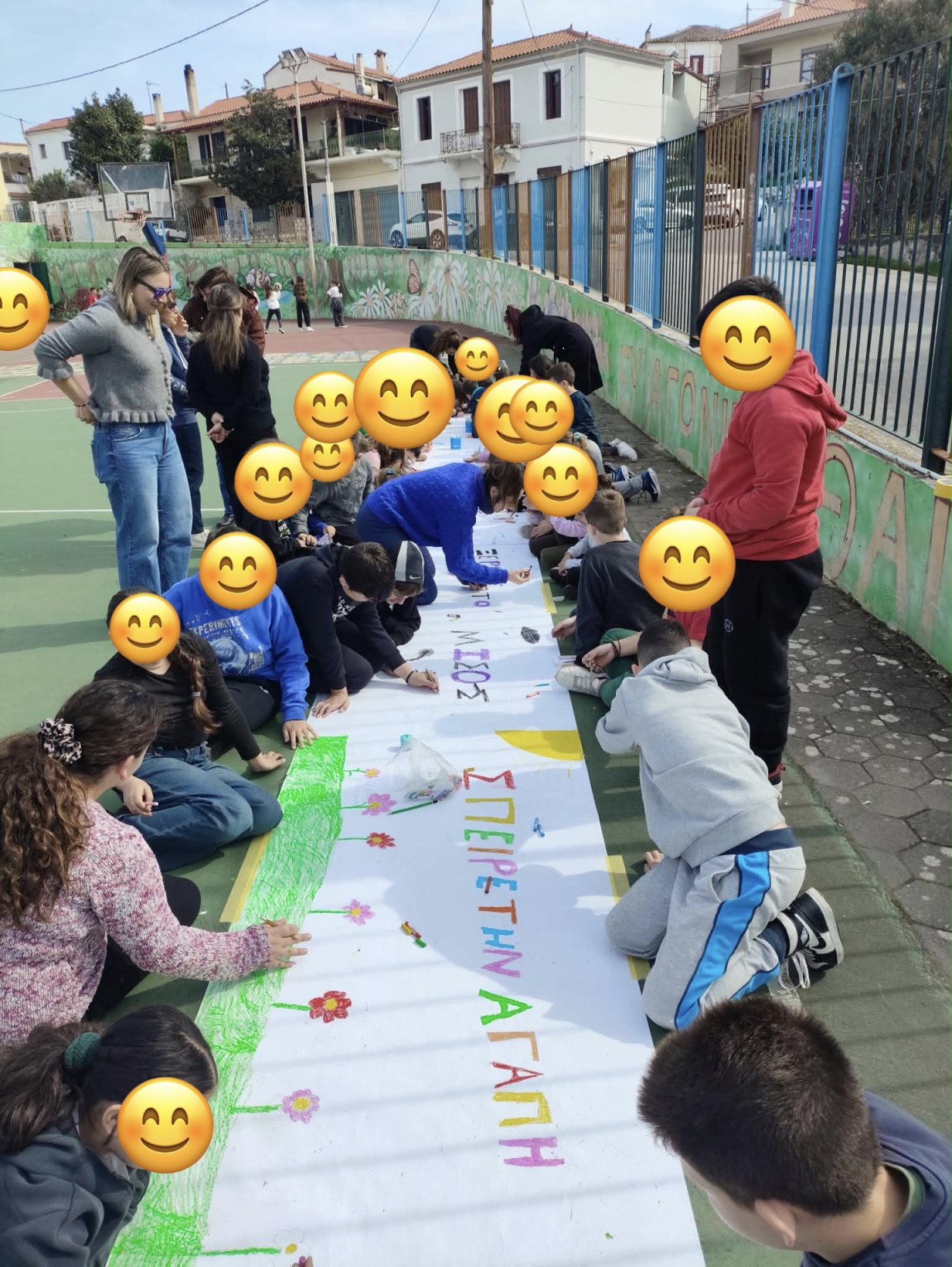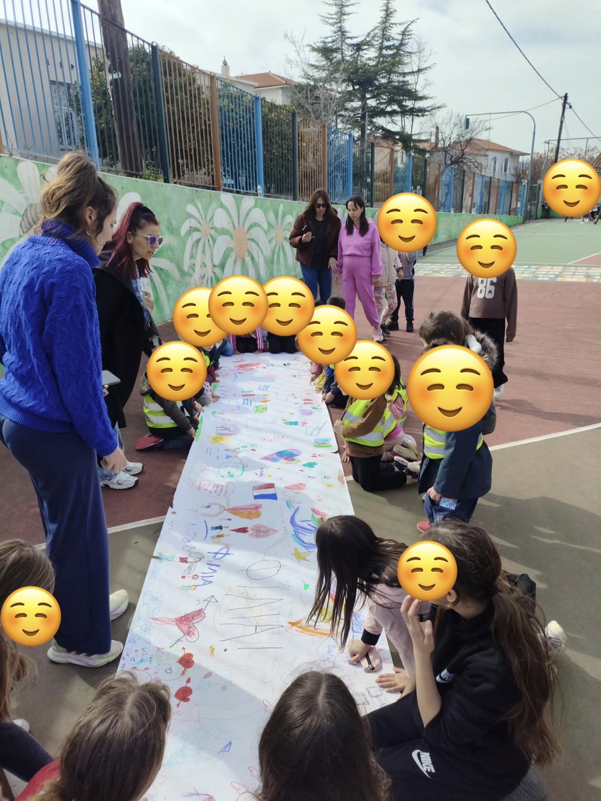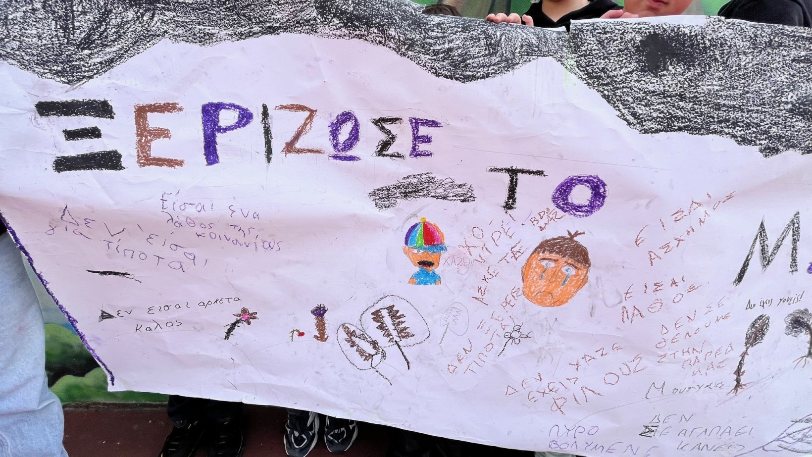Τα παιδιά, μέσα από ζωγραφιές, λέξεις και μικρά μηνύματα, αποτύπωσαν επάνω στο πανό τις σκέψεις και τα συναισθήματά τους σχετικά με τη σημασία της καλοσύνης, της αποδοχής και της αλληλεγγύης μεταξύ των συμμαθητών.