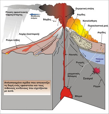 Στην ακόλουθη εικόνα φαίνονται τα μέρη ενός ηφαιστείου που εκρήγνυται.