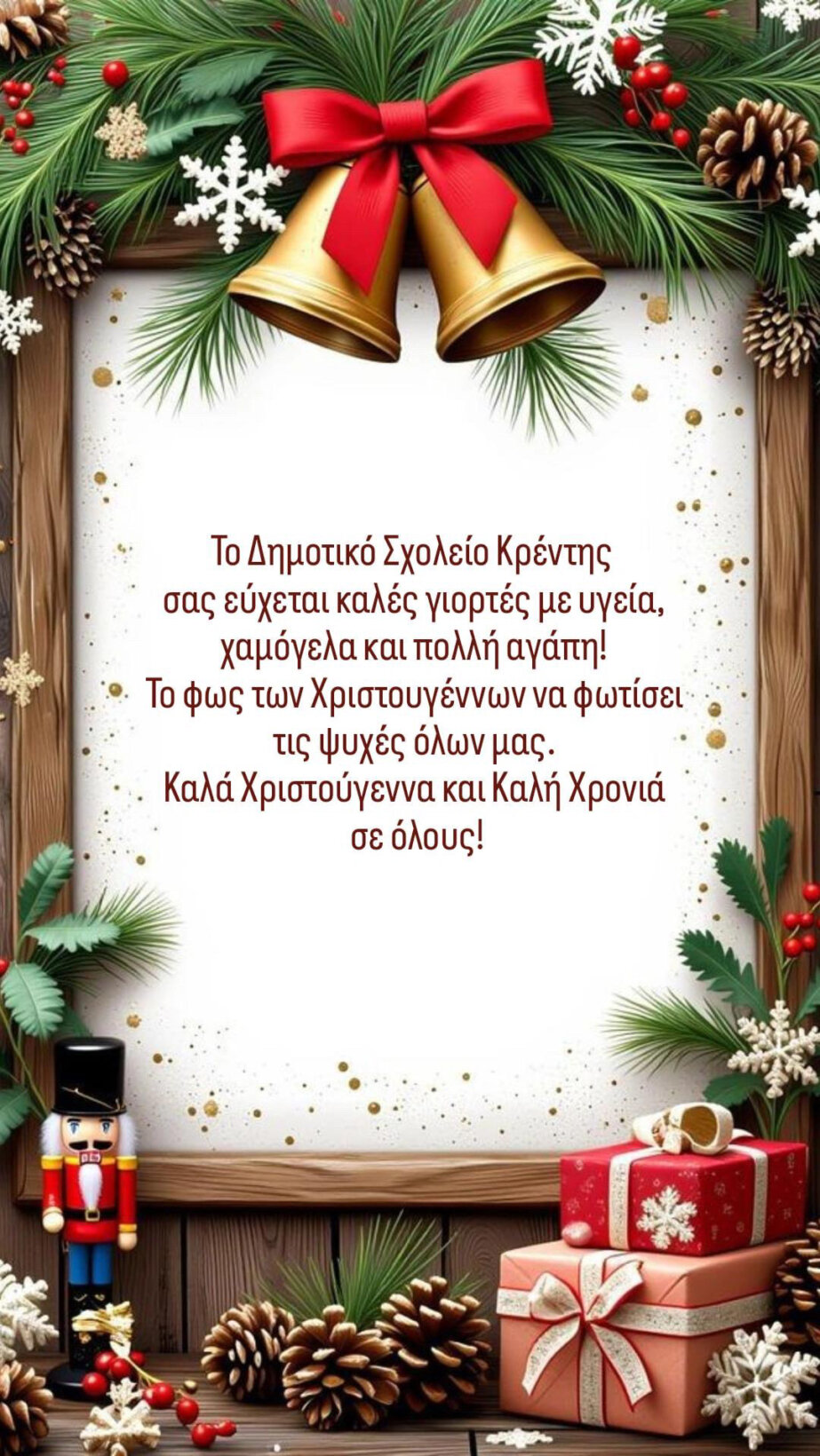 Ήρθε η ώρα να αποχαιρετίσουμε το 2024 και να υποδεχτούμε το 2025 με υγεία, αγάπη, χαμόγελα και όμορφες στιγμές με τις οικογένειές μας! Οι μαθητές και οι εκπαιδευτικοί του Δημοτικού Σχολείου Κρέντης εύχονται Καλά Χριστούγεννα και Καλή Χρονιά σε όλους!