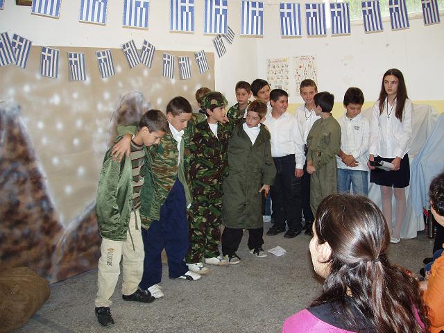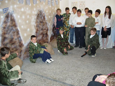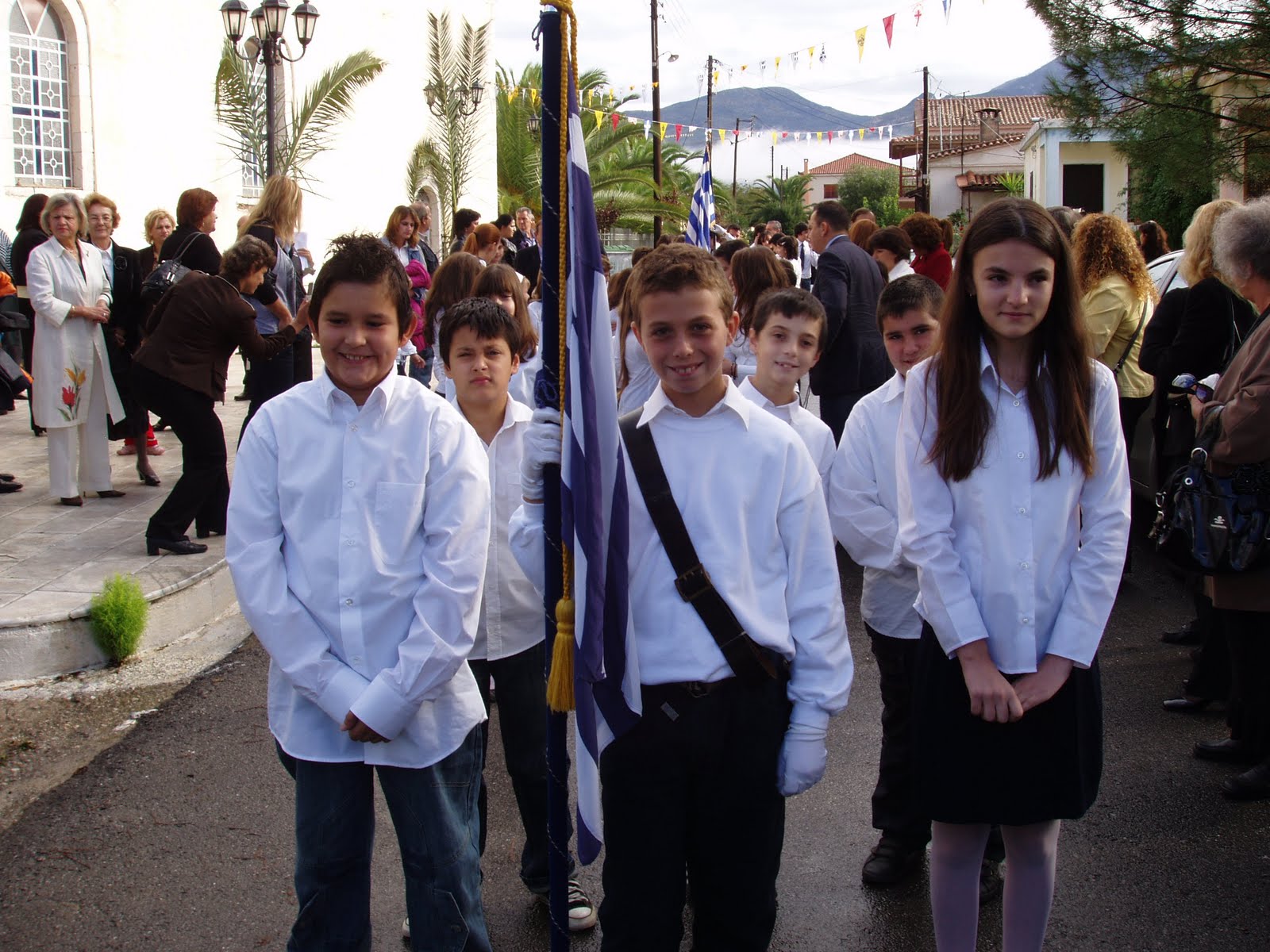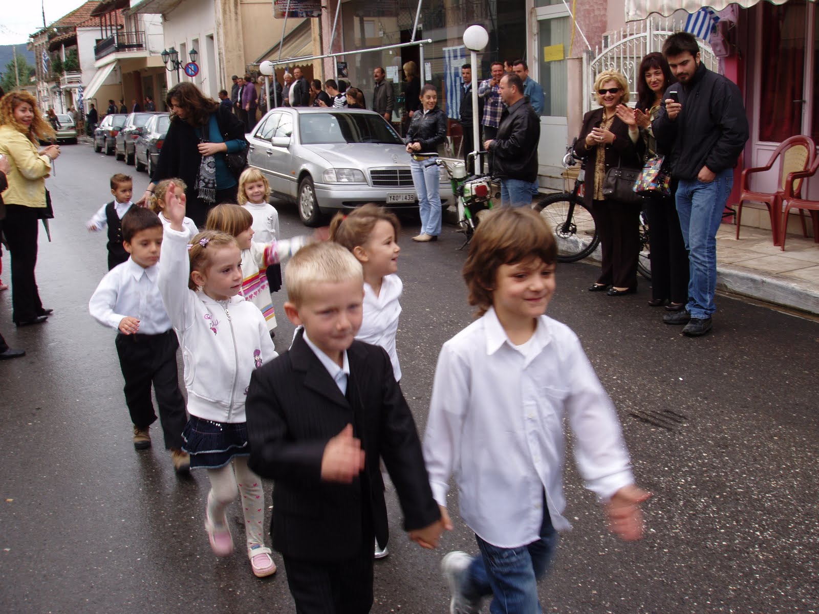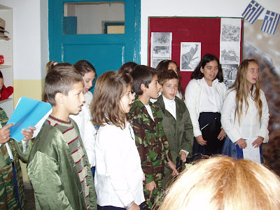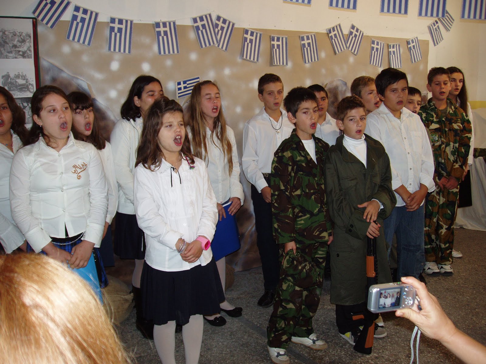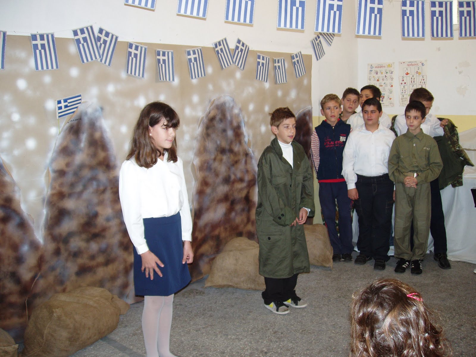 Η ΓΙΟΡΤΗ ΣΤΟ ΣΧΟΛΕΙΟ ΜΑΣ 27.10.2010 Κι αν είναι η Ελλάδα τόση δα στο χάρτη μια κουκλιδα, είναι η ωραιότερη στον κόσμο αυτό πατρίδα. Πάνω σε αυτή το δάχτυλο όλοι οι λαοί ακουμπούνε και τους παλμούς της λευτεριάς ακούνε να χτυπούνε. Το χρονικό της 28ης Οκτωβρίου 1940 απο τους μαθητές της Έ και ΄Στ τάξης ποιήματα , σκέτς και τραγούδια