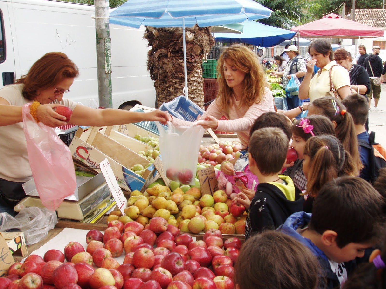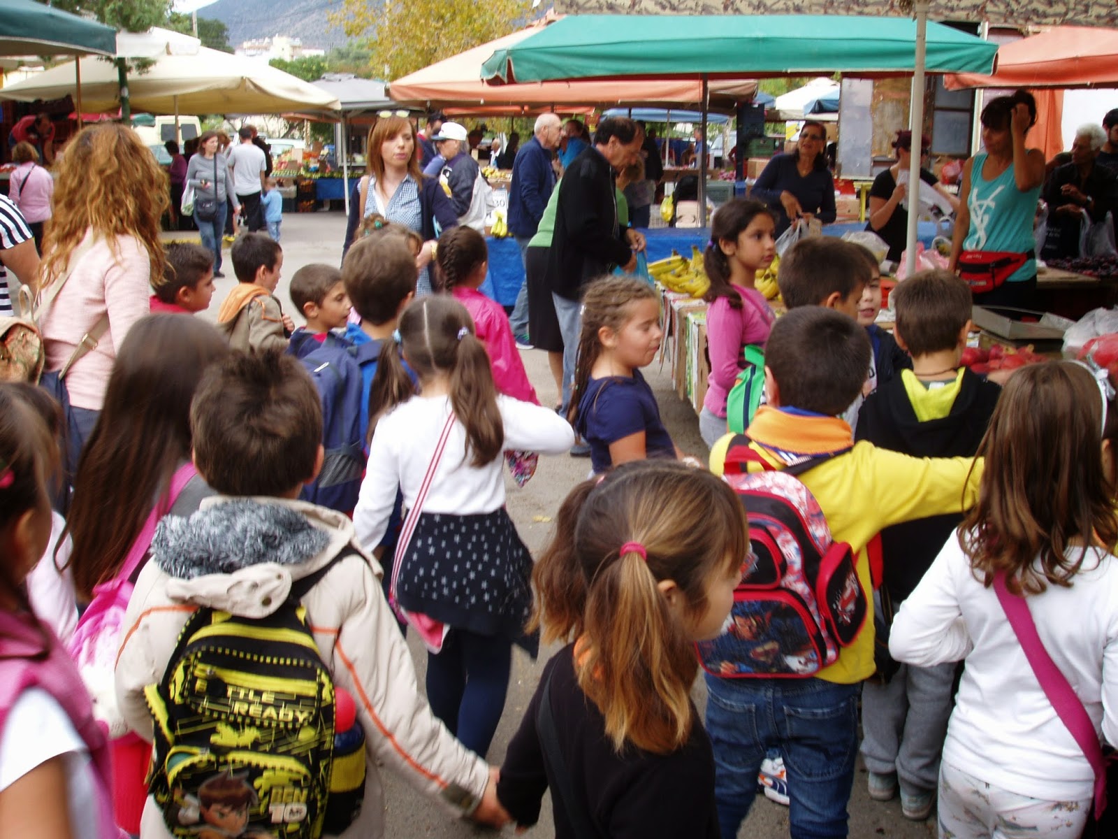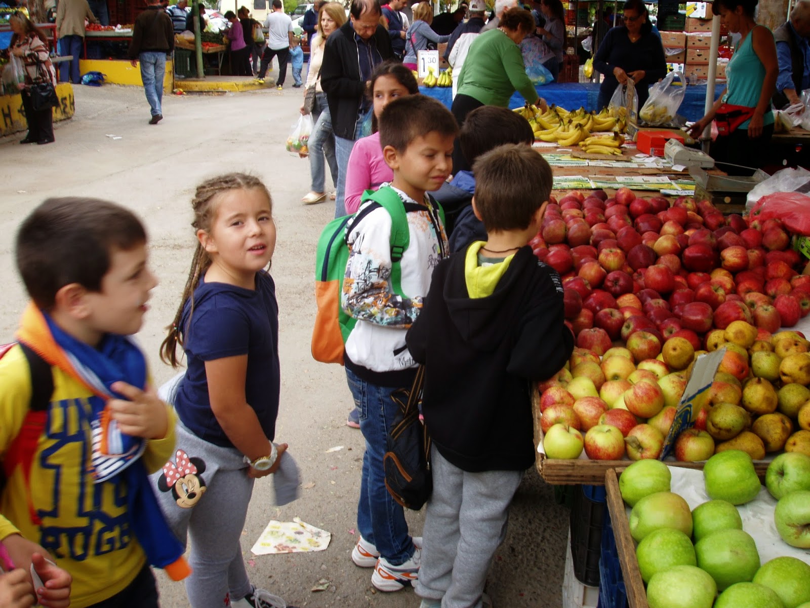 Έπειτα επισκεφθήκαμε τη λαϊκή αγορά, στα πλαίσια του εκπαιδευτικού προγράμματος διατροφής και υγείας “Τρώω φρούτα και λαχανικά”. Εκεί τα παιδιά, κάνοντας την περιήγησή τους στο στεγασμένο και τον ανοιχτό χώρο της αγοράς, μπόρεσαν να μυρίσουν, να γευτούν και να συγκρίνουν τα προϊόντα και τις τιμές τους, να γίνουν και οι ίδιοι δημοσιογράφοι κάνοντας ερωτήσεις στους παραγωγούς σχετικές με τις ποσότητες των προϊόντων, την προέλευσή τους, την επιρροή της οικονομικής κρίσης στην παραγωγή τους κ.ά. Ακόμη, τα παιδιά βρέθηκαν σε ρόλο πωλητή και όχι μόνο κέρδισαν τις εντυπώσεις, αλλά έφυγαν και με τσάντες γεμάτες φρούτα και λαχανικά!
