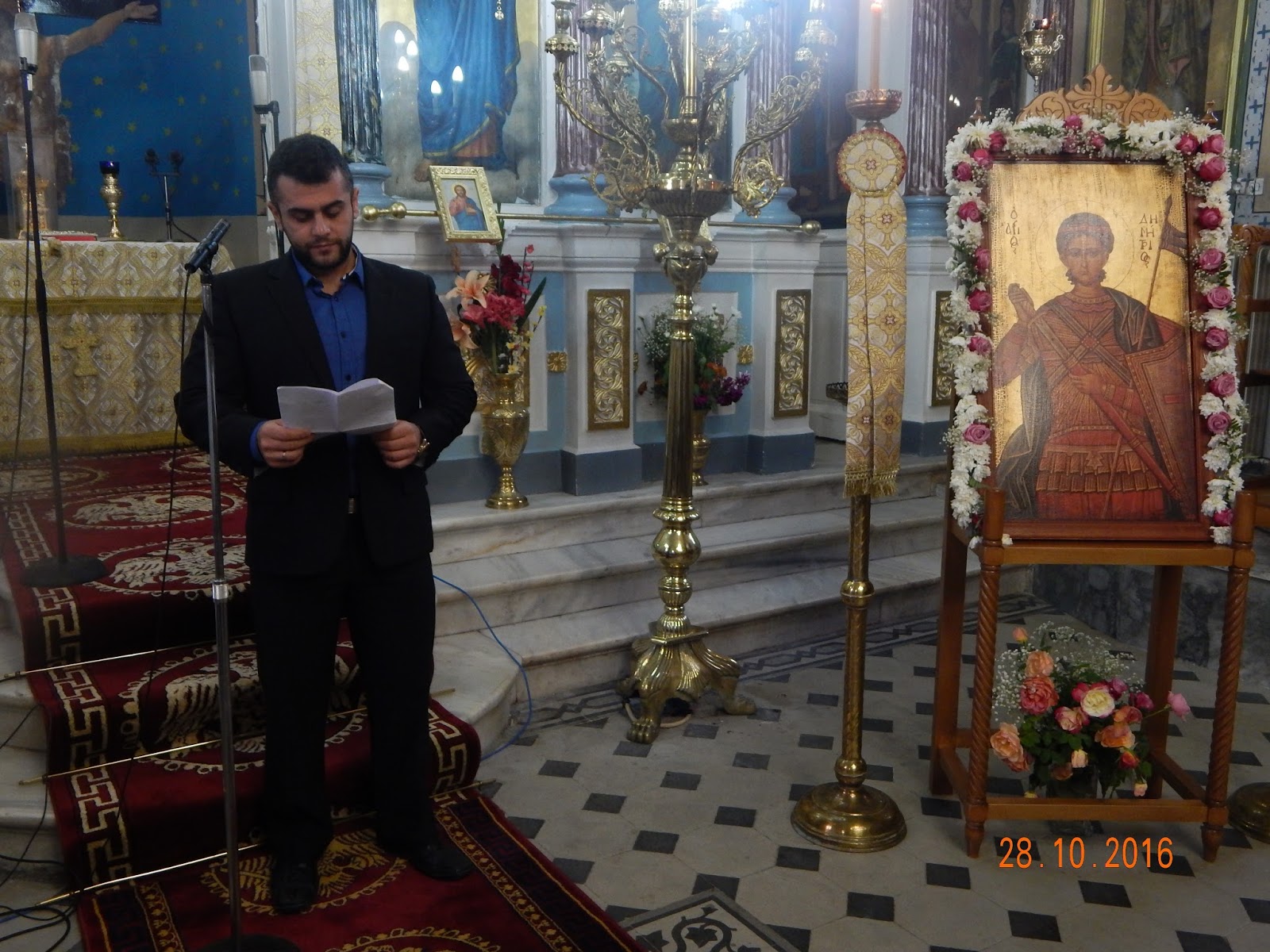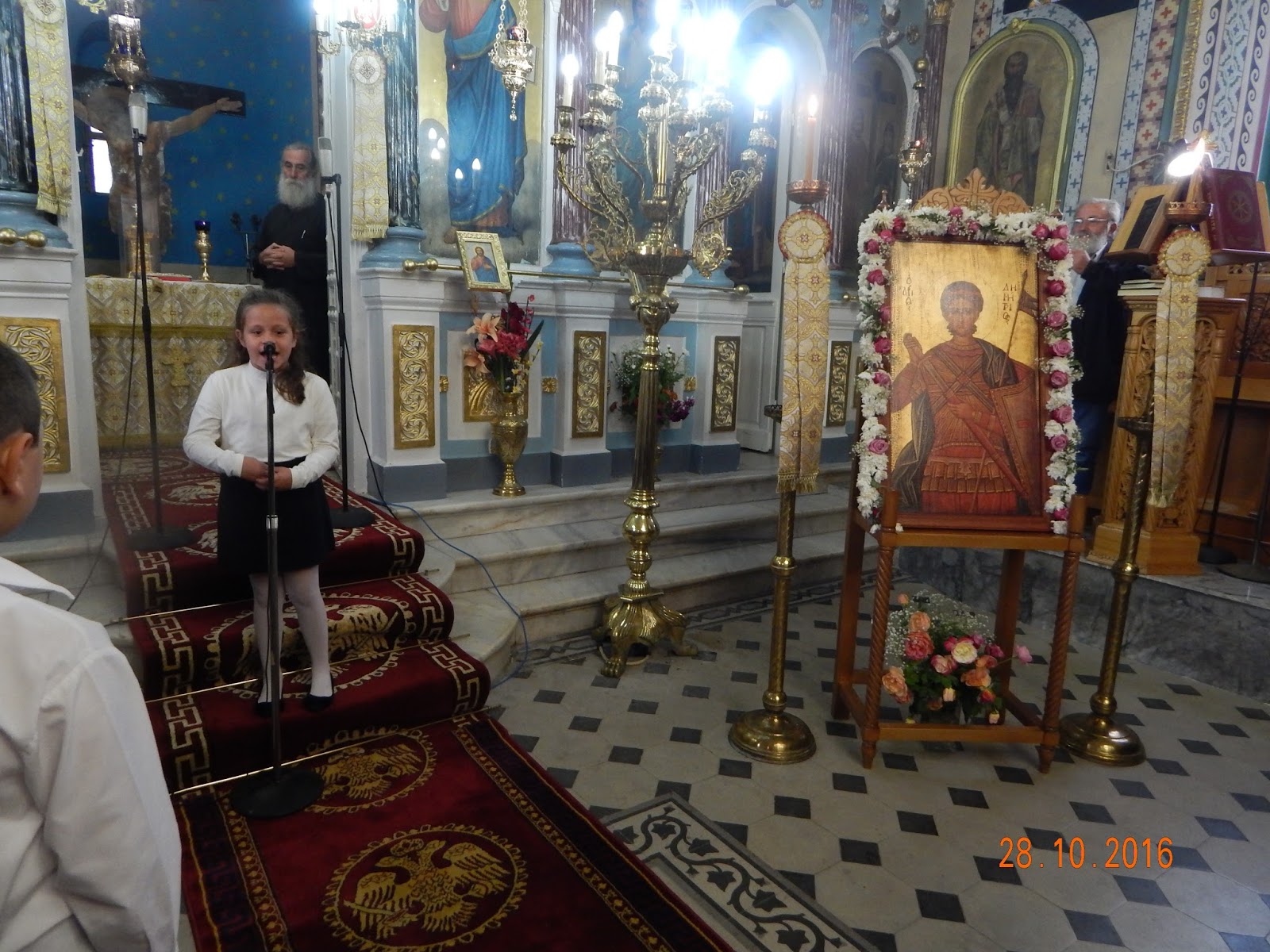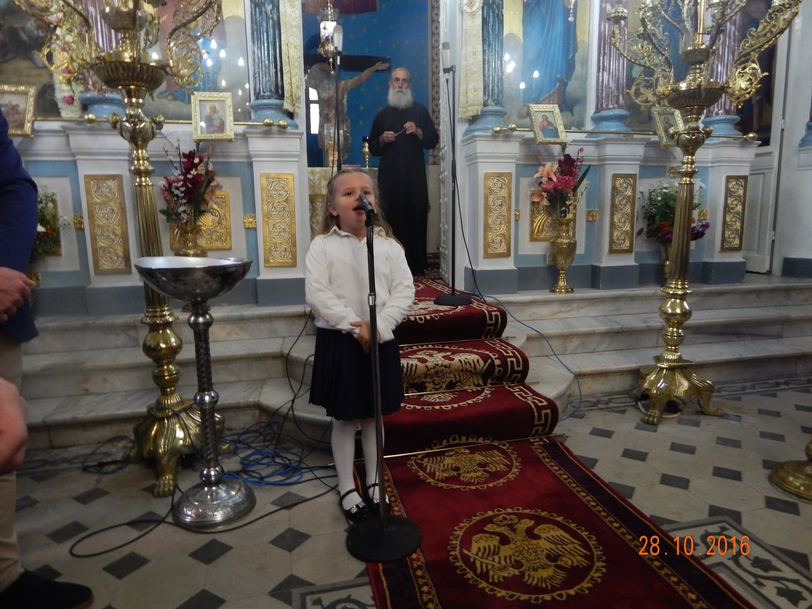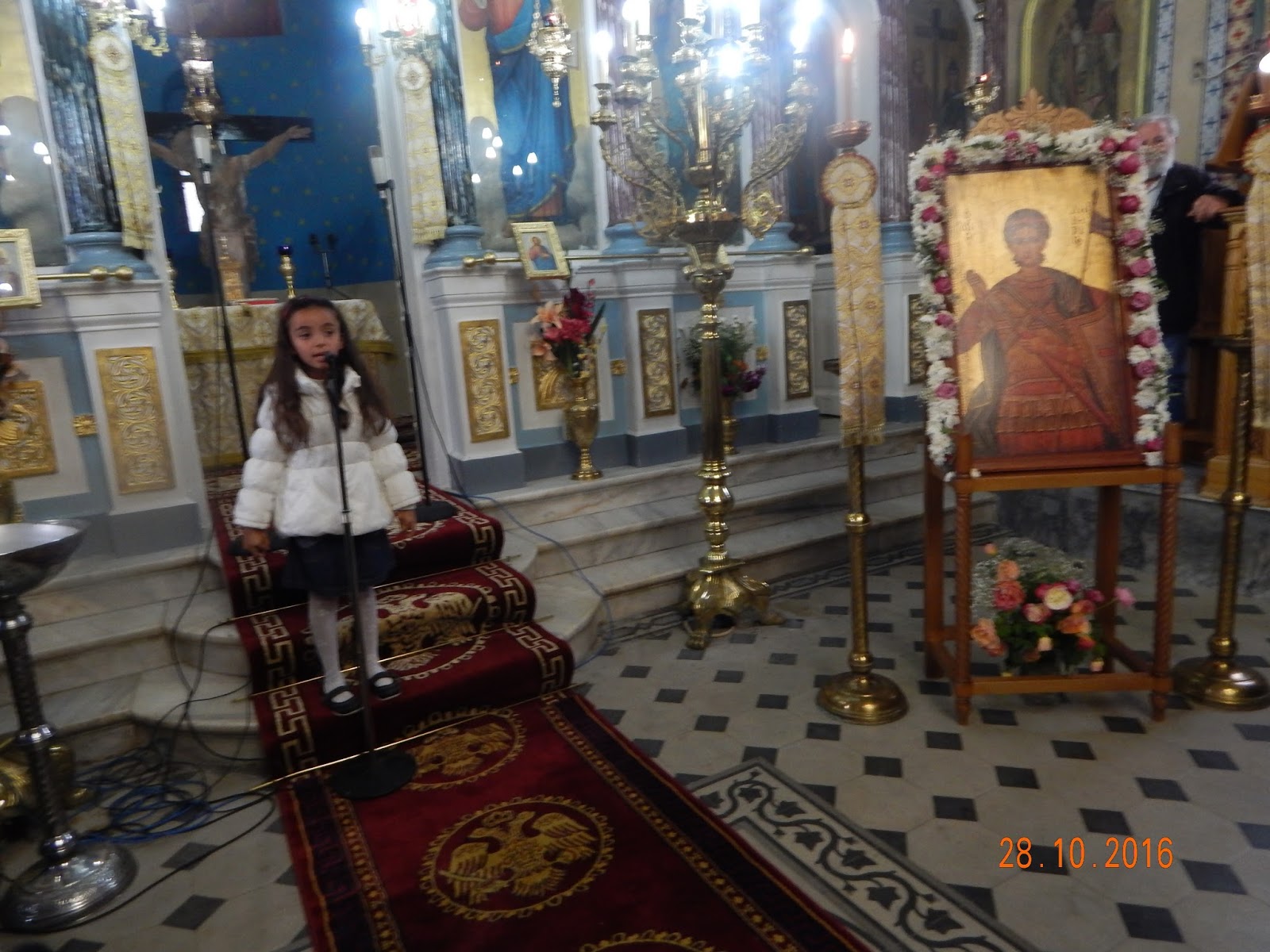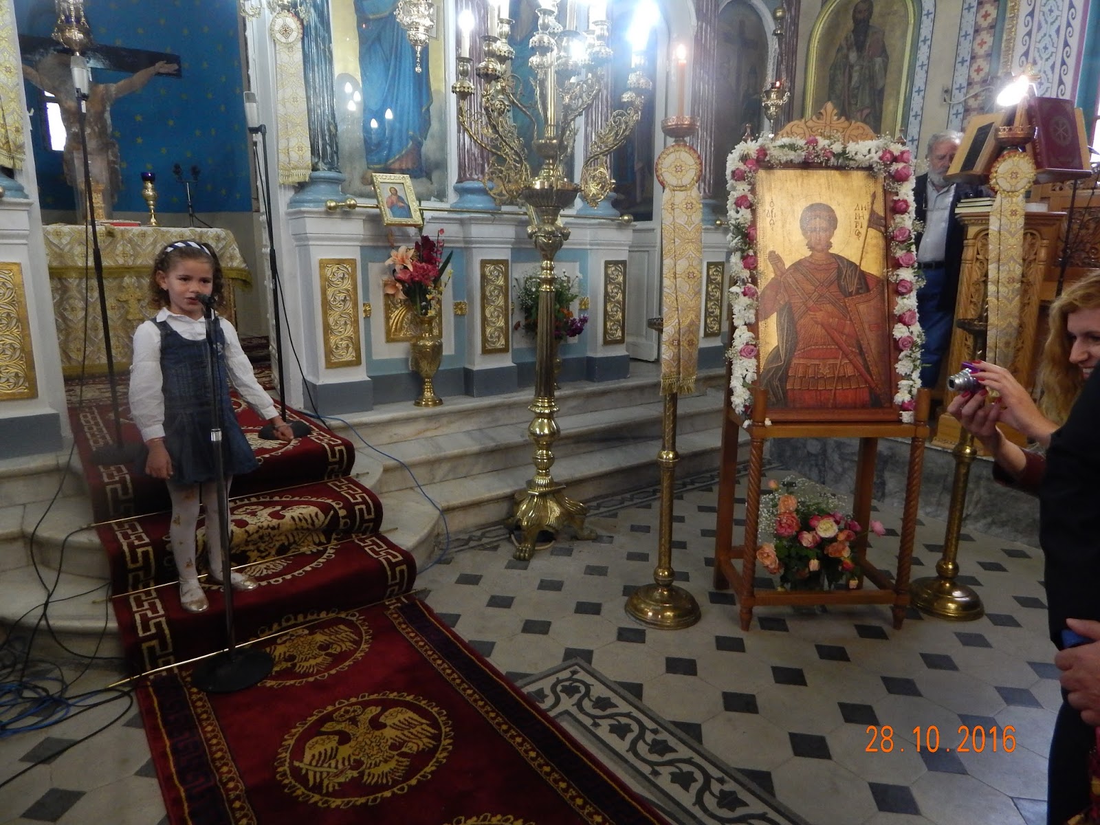 Την ημέρα της εθνικής επετείου του 1940, στις 28 Οκτωβρίου, πήγαμε στην εκκλησία. Τον πανηγυρικό λόγο της ημέρας εκφώνησε ο δάσκαλος της Γ΄ τάξης Κωνσταντίνος Παπαεμμανουήλ. Ακολούθησαν ποιήματα από τους μαθητές των Α΄ και Β΄ τάξεων και του νηπιαγωγείου.