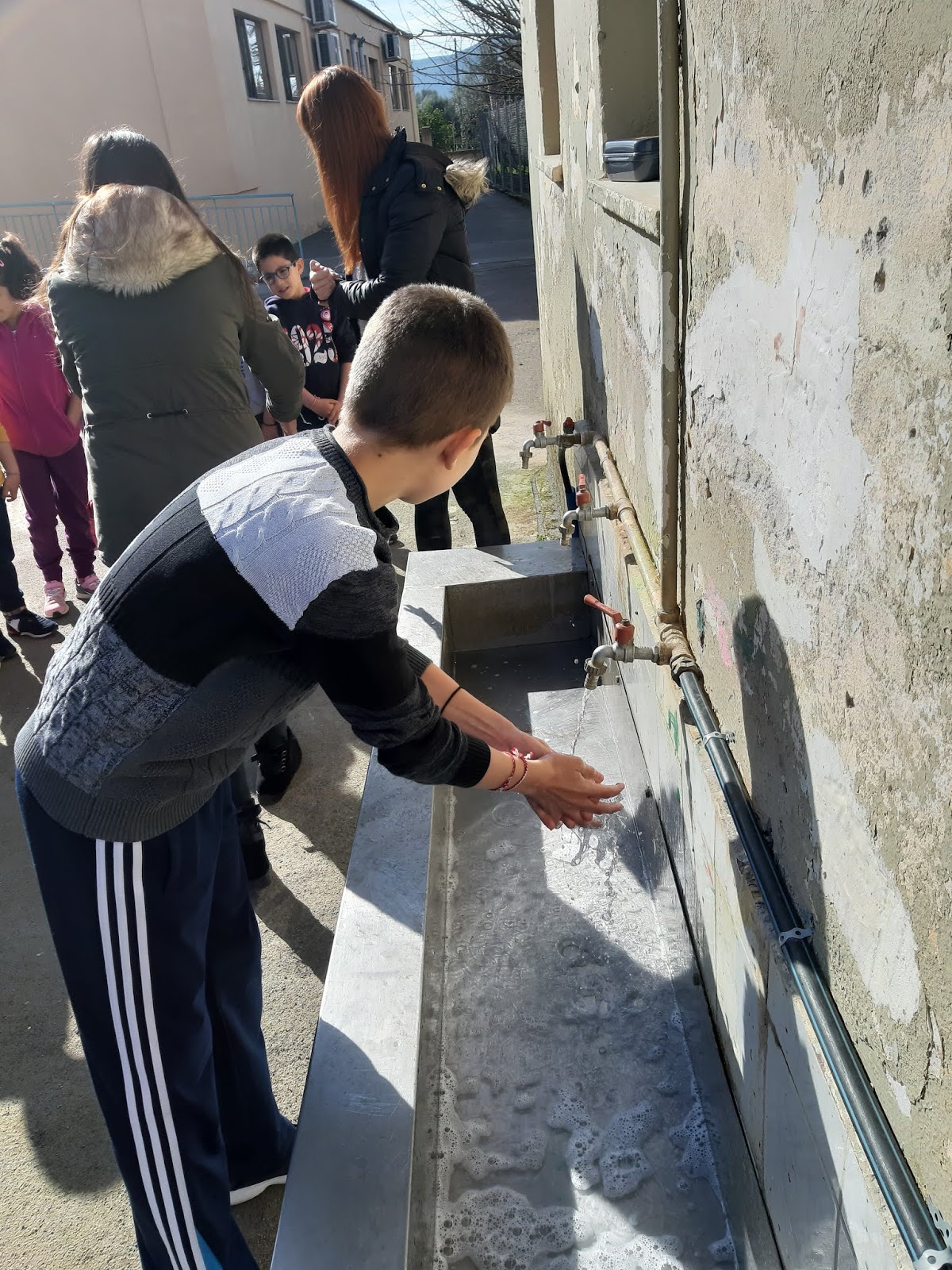 Τονίσαμε στα παιδιά τις οδηγίες ατομικής υγιεινής με ιδιαίτερη σημασία στο πλύσιμο των χεριών πριν και μετά την τουαλέτα ή πριν από το γεύμα τους. Η δασκάλα της Α΄ τάξης εξήγησε  ακριβώς τη διαδικασία πλυσίματος και ακολούθησε παράδειγμα από τους μαθητές των μεγάλων τάξεων.